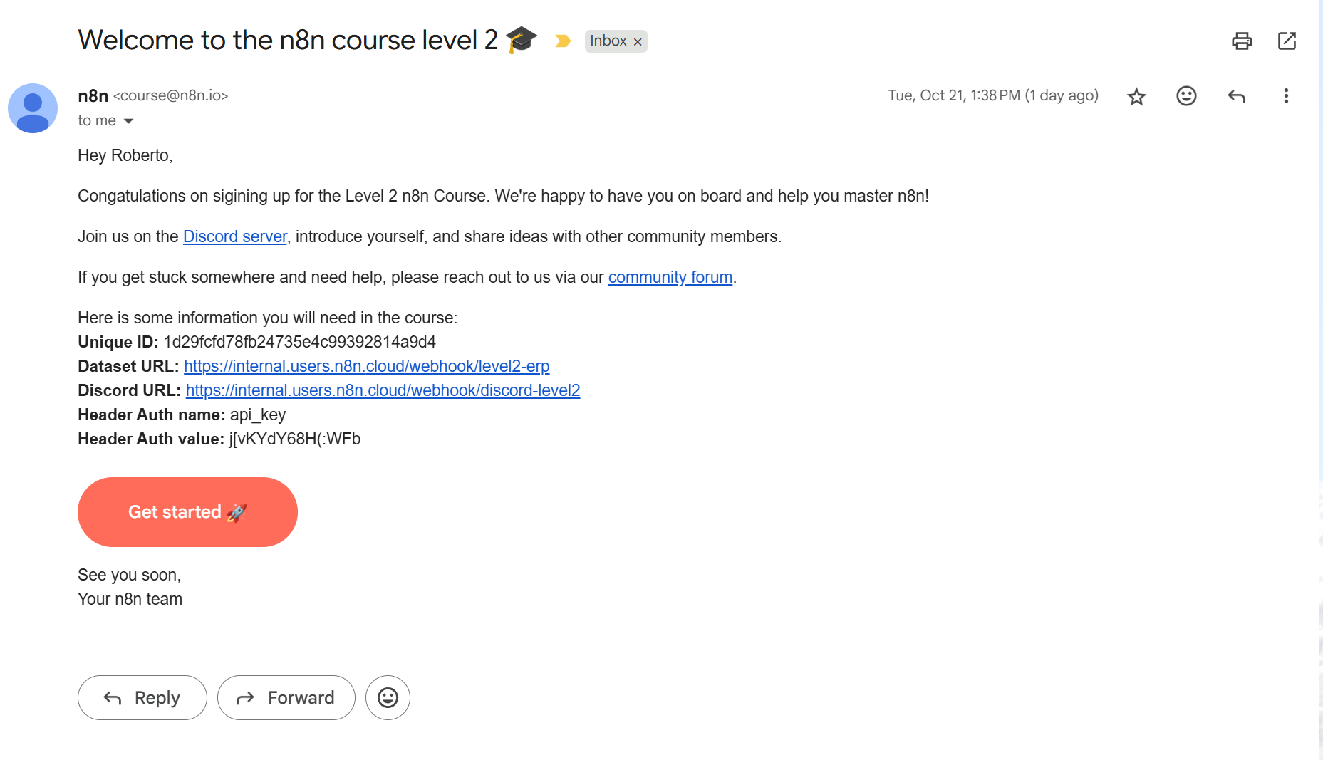 I get a Problem in Discord node when executing the Workflow 2 for the Level 2 course. The Discord webhook connection test with credentials provided in the email is successful.