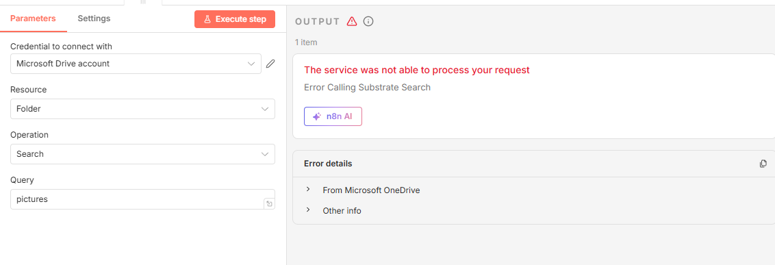 I am experiencing an issue with the “Search” operation in the “n8n-nodes-base.microsoftOneDrive” node.
