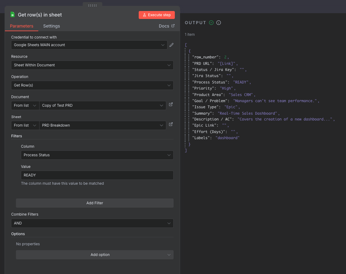 The goal is to get the row where the Process Status column (Column D) equals READY. In my n8n workflow, the node is returning ‘No output data’ even with this simple test.