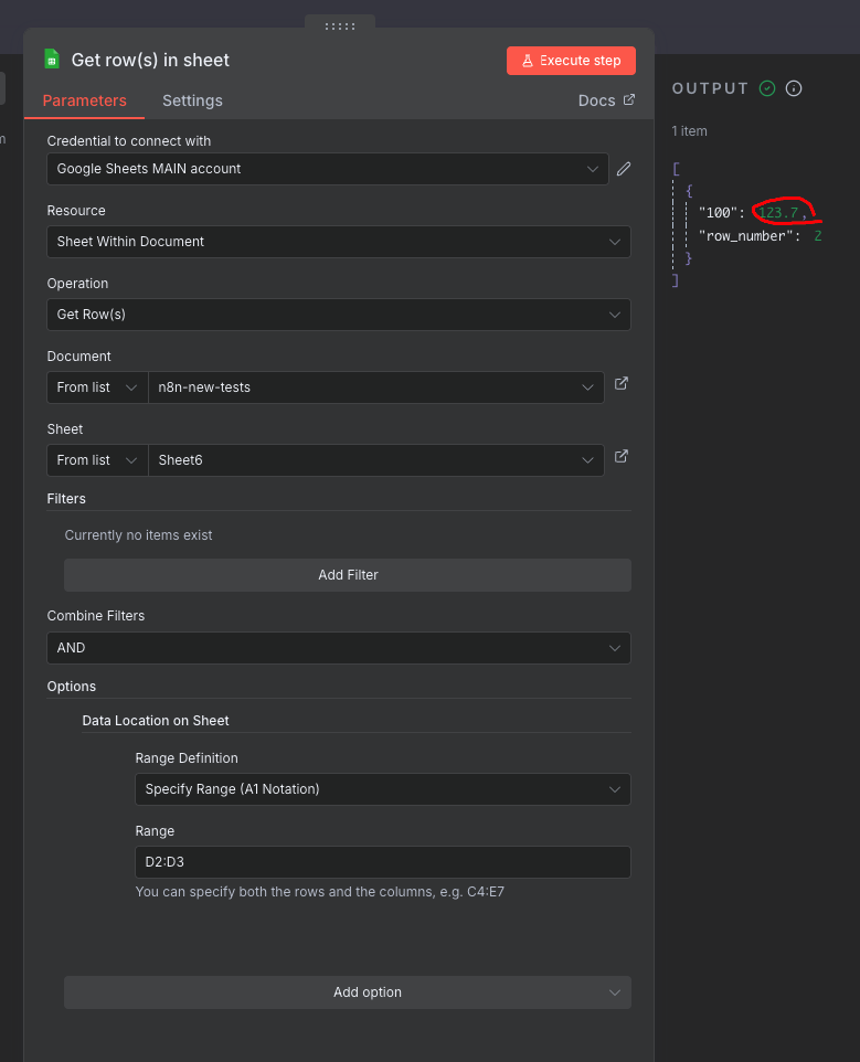 This test proves that my Google account has the correct permissions and the sheet is readable. The problem seems to be specifically with the n8n node.