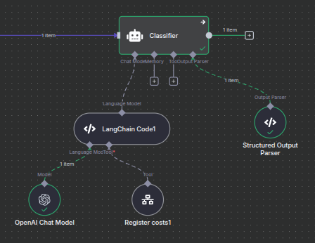 {“nodes”: [{“parameters”: {“code”: {“supplyData”: {“code”: “const llm = await this.getInputConnectionData(‘ai_languageModel’, 0);\n\nllm.callbacks = [\n {\n handleLLMEnd: async (data) => {\n console.log("data: ", data);\n },\n },\n];\n\nreturn llm;”}},“inputs”: {“input”: [{“type”: “ai_languageModel”,“maxConnections”: 1,“required”: true},{“type”: “ai_tool”,“maxConnections”: 1,“required”: true}]},“outputs”: {“output”: [{“type”: “ai_languageModel”}]}},“type”: “/n8n-nodes-langchain.code”,“typeVersion”: 1,“position”: [-496,640],“id”: “48e10e40-7905-4286-b0de-16ceae563550”,“name”: “LangChain Code1”},{“parameters”: {“options”: {}},“type”: “/n8n-nodes-langchain.lmChatGoogleGemini”,“typeVersion”: 1,“position”: [-896,848],“id”: “7561396e-81b6-4730-a103-e2f554a9c40a”,“name”: “Google Gemini Chat Model2”,“credentials”: {“googlePalmApi”: {“id”: “m7m7IR8HeFUdk66g”,“name”: “Google Gemini(PaLM) Api account Marcia”}}},{“parameters”: {“workflowId”: {“__rl”: true,“value”: “69SQGUCQbrfE3pz8”,“mode”: “list”,“cachedResultName”: “[Prod] - Marcia Aires Token Counter”},“workflowInputs”: {“mappingMode”: “defineBelow”,“value”: {“date”: “={{ /n8n-auto-generated-fromAI-override/ $fromAI(‘date’, ``, ‘string’) }}”,“model”: “={{ /n8n-auto-generated-fromAI-override/ $fromAI(‘model’, ``, ‘string’) }}”,“input_tokens”: “={{ /n8n-auto-generated-fromAI-override/ $fromAI(‘input_tokens’, ``, ‘string’) }}”,“output_tokens”: “={{ /n8n-auto-generated-fromAI-override/ $fromAI(‘output_tokens’, ``, ‘string’) }}”,“total_tokens”: “={{ /n8n-auto-generated-fromAI-override/ $fromAI(‘total_tokens’, ``, ‘string’) }}”,“workflowID”: “={{ /n8n-auto-generated-fromAI-override/ $fromAI(‘workflowID’, ``, ‘string’) }}”,“executionId”: “={{ /n8n-auto-generated-fromAI-override/ $fromAI(‘executionId’, ``, ‘string’) }}”,“conversationId”: “={{ /n8n-auto-generated-fromAI-override/ $fromAI(‘conversationId’, ``, ‘string’) }}”,“inboxId”: “={{ /n8n-auto-generated-fromAI-override/ $fromAI(‘inboxId’, ``, ‘string’) }}”},“matchingColumns”: ,“schema”: [{“id”: “date”,“displayName”: “date”,“required”: false,“defaultMatch”: false,“display”: true,“canBeUsedToMatch”: true,“type”: “string”},{“id”: “model”,“displayName”: “model”,“required”: false,“defaultMatch”: false,“display”: true,“canBeUsedToMatch”: true,“type”: “string”},{“id”: “input_tokens”,“displayName”: “input_tokens”,“required”: false,“defaultMatch”: false,“display”: true,“canBeUsedToMatch”: true,“type”: “string”},{“id”: “output_tokens”,“displayName”: “output_tokens”,“required”: false,“defaultMatch”: false,“display”: true,“canBeUsedToMatch”: true,“type”: “string”},{“id”: “total_tokens”,“displayName”: “total_tokens”,“required”: false,“defaultMatch”: false,“display”: true,“canBeUsedToMatch”: true,“type”: “string”},{“id”: “workflowID”,“displayName”: “workflowID”,“required”: false,“defaultMatch”: false,“display”: true,“canBeUsedToMatch”: true,“type”: “string”},{“id”: “executionId”,“displayName”: “executionId”,“required”: false,“defaultMatch”: false,“display”: true,“canBeUsedToMatch”: true,“type”: “string”},{“id”: “conversationId”,“displayName”: “conversationId”,“required”: false,“defaultMatch”: false,“display”: true,“canBeUsedToMatch”: true,“type”: “string”},{“id”: “inboxId”,“displayName”: “inboxId”,“required”: false,“defaultMatch”: false,“display”: true,“canBeUsedToMatch”: true,“type”: “string”}],“attemptToConvertTypes”: false,“convertFieldsToString”: false}},“type”: “/n8n-nodes-langchain.toolWorkflow”,“typeVersion”: 2.2,“position”: [-352,816],“id”: “62090740-2a5c-4622-bc07-169c51157207”,“name”: “Register costs1”},{“parameters”: {“promptType”: “define”,“text”: “={{ $json.chatInput }}”,“hasOutputParser”: true,“options”: {“systemMessage”: “=prompt here”}},“type”: “/n8n-nodes-langchain.agent”,“typeVersion”: 2,“position”: [-384,400],“id”: “cca56d91-2139-4a42-a4b9-eb130308403e”,“name”: “Classifier”,“onError”: “continueRegularOutput”},{“parameters”: {“jsonSchemaExample”: “{\n\t"acao": "prosseguir_com_agente"\n}”},“type”: “/n8n-nodes-langchain.outputParserStructured”,“typeVersion”: 1.3,“position”: [-48,624],“id”: “f9652e6d-2b5e-4dd2-9f48-9021189c75b8”,“name”: “Structured Output Parser”},{“parameters”: {},“type”: “n8n-nodes-base.manualTrigger”,“typeVersion”: 1,“position”: [-1088,208],“id”: “ff9f91ae-d55e-49e4-ac64-b22f41212986”,“name”: “When clicking ‘Execute workflow’”},{“parameters”: {“model”: {“__rl”: true,“mode”: “list”,“value”: “gpt-4.1-mini”},“options”: {}},“type”: “/n8n-nodes-langchain.lmChatOpenAi”,“typeVersion”: 1.2,“position”: [-608,832],“id”: “7e3ede51-d6ea-4f99-9433-c86f55acea80”,“name”: “OpenAI Chat Model”,“credentials”: {“openAiApi”: {“id”: “rwpcnKnM63q8S6KH”,“name”: “OpenAI - MARS”}}},{“parameters”: {“jsCode”: “return $input.all();”},“type”: “n8n-nodes-base.code”,“typeVersion”: 2,“position”: [-832,400],“id”: “b58e315c-268e-49fd-9d20-97362c63c43c”,“name”: “Code”},{“parameters”: {“options”: {}},“type”: “/n8n-nodes-langchain.chatTrigger”,