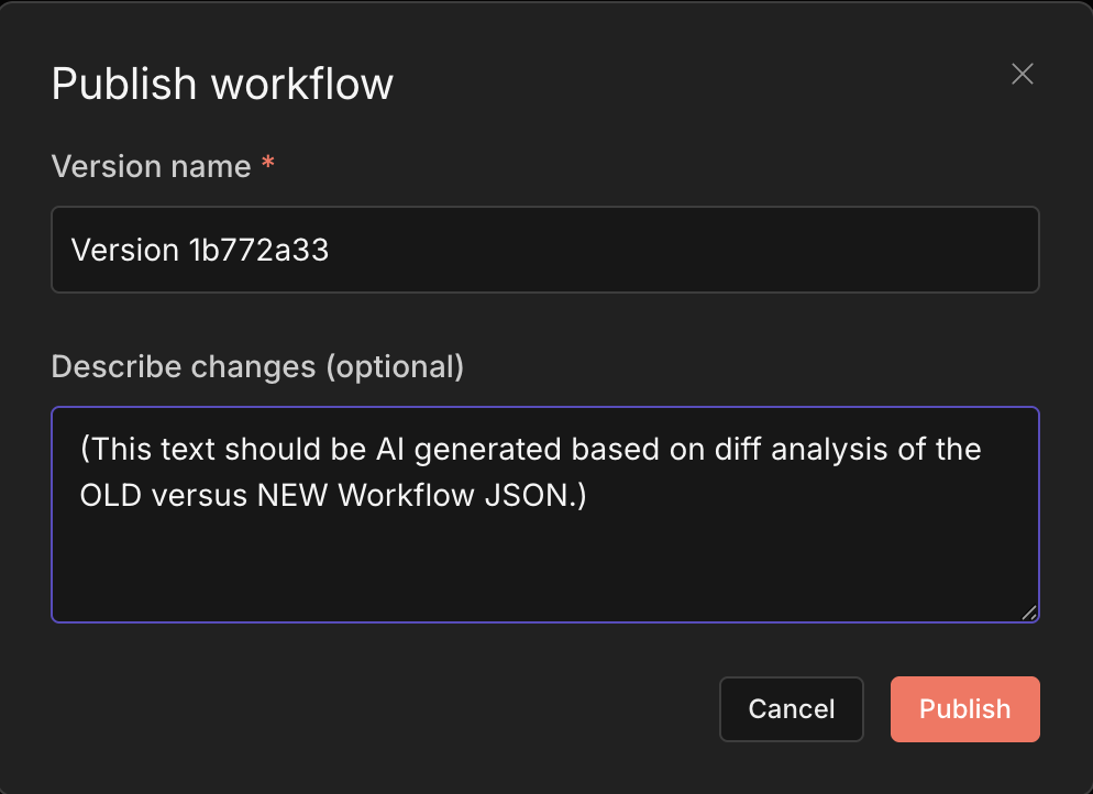 Then, this diff would get sent to an LLM (as specified by the n8n administrator), where the LLM could then populate the Describe changes (optional) text, which the workflow editor could review prior to pressing the Publish button.