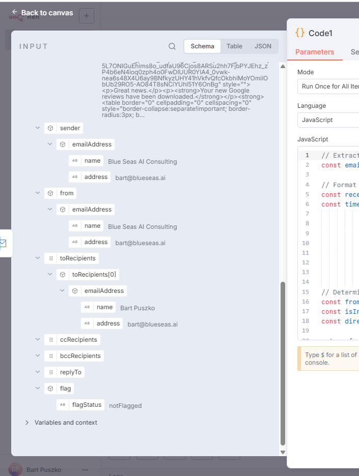 My problem is that I haven’t been able to replicate a “sent on behalf of” scenario in my own testing environment, so I can’t inspect the JSON output to see what it looks like. Without knowing the specific field name and data structure, I can’t build the conditional logic (e.g., in an IF or Code node) to handle these cases correctly.