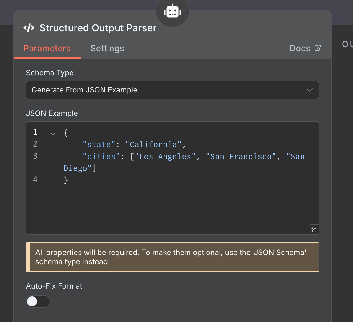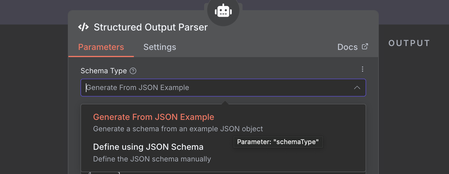 3. Select a schema type. I believe in your case you should select “Define using JSON Schema” because you will get more control, flexibility, and precise validation of the output data. This is the more powerful and scalable option for complex workflows.