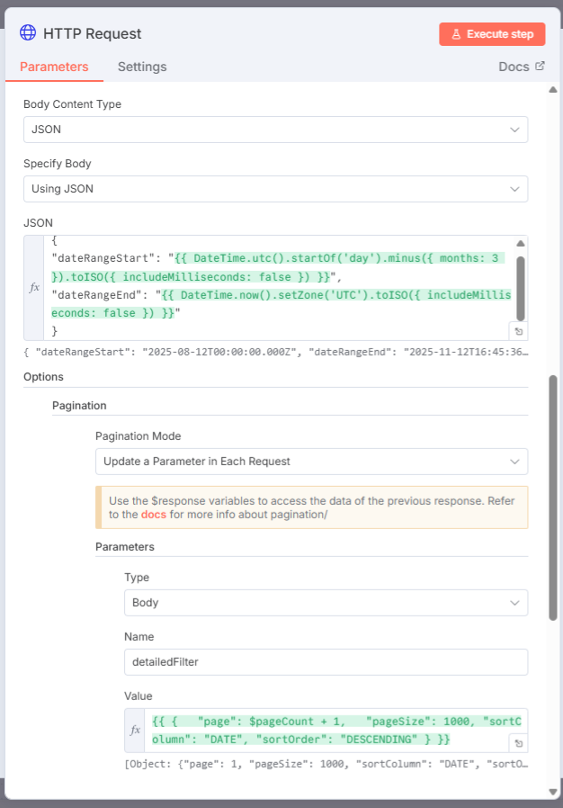 Context: Fetching data via API from Clockify Detaliled Report. My connection to the API is good as I’m able to retrieve the first page of data (max 1000 entries) but can’t get to move to the second page using n8n and the Pagination in HTTP request node. I’ve successfully implemented the pagination in Python Notebook, so I’m confident the request JSON is correct.