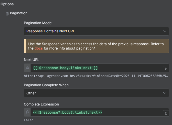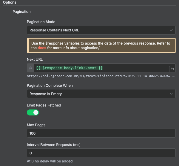 I’m newbie in n8n and I’m trying to use HTTP Request node to download info from an API from Agendor CRM. When I use a GET with manual parameters everything seems to be allright, but when I tried using pagination to get data from multiple pages, it’s not working the way I want and I don’t know how to solve.