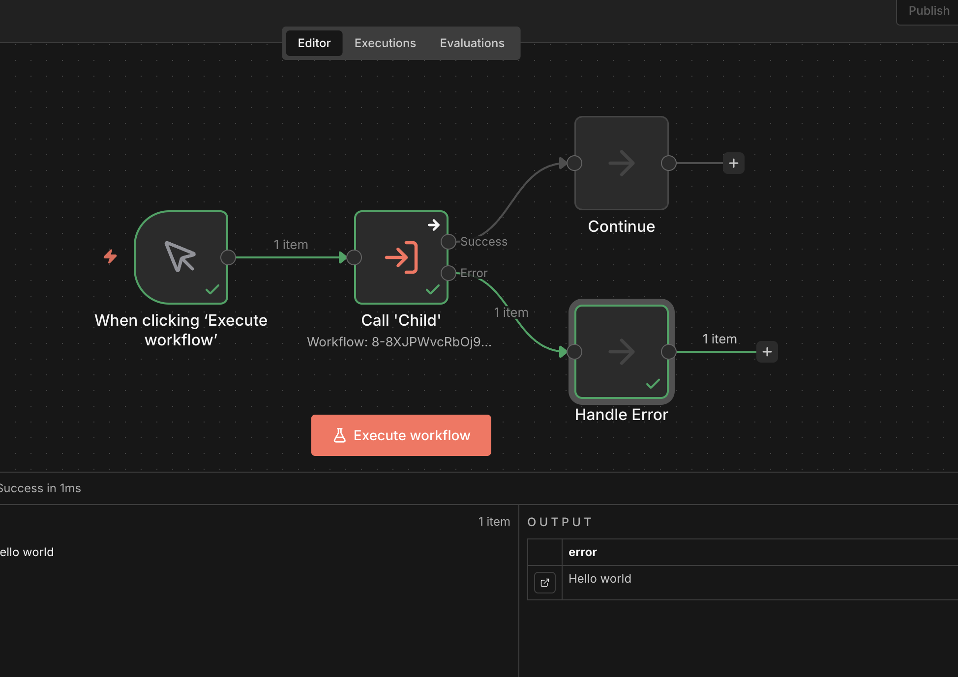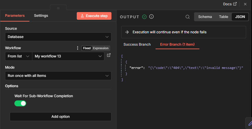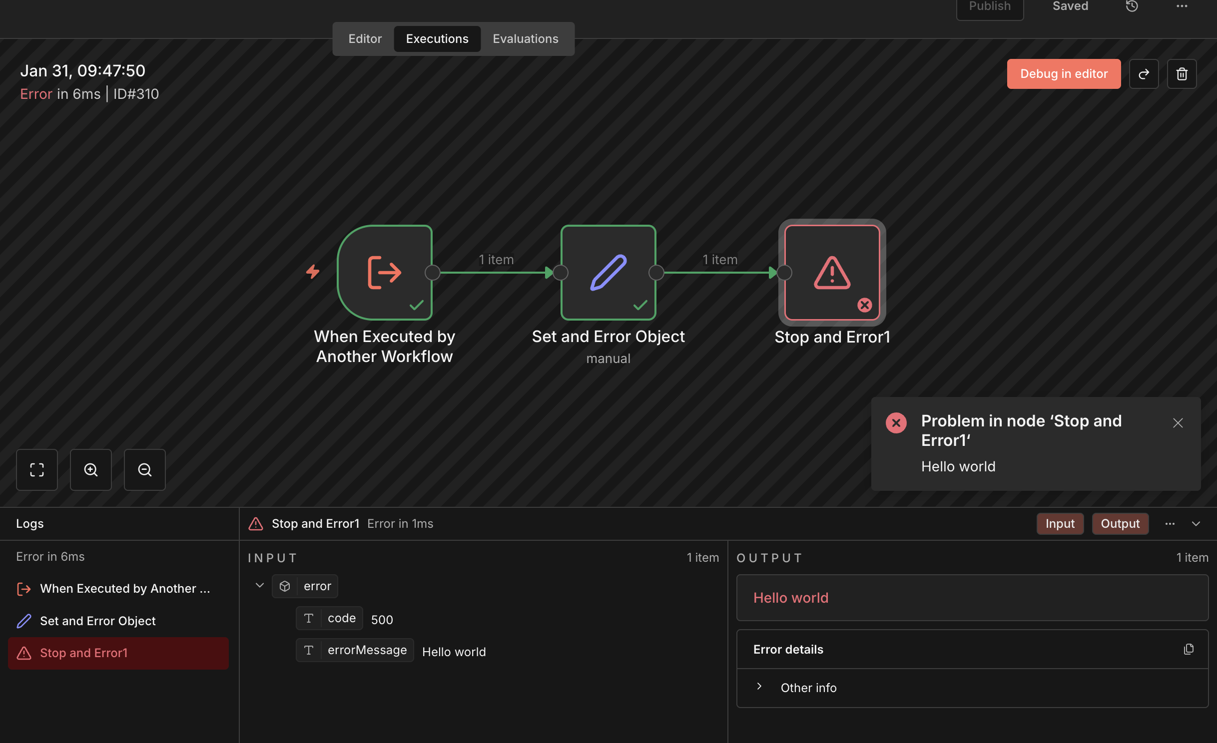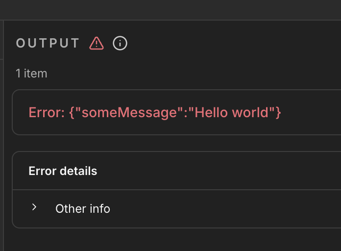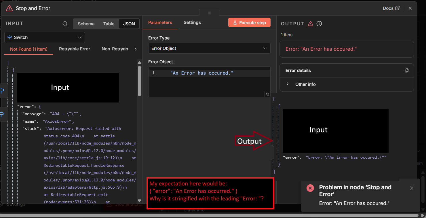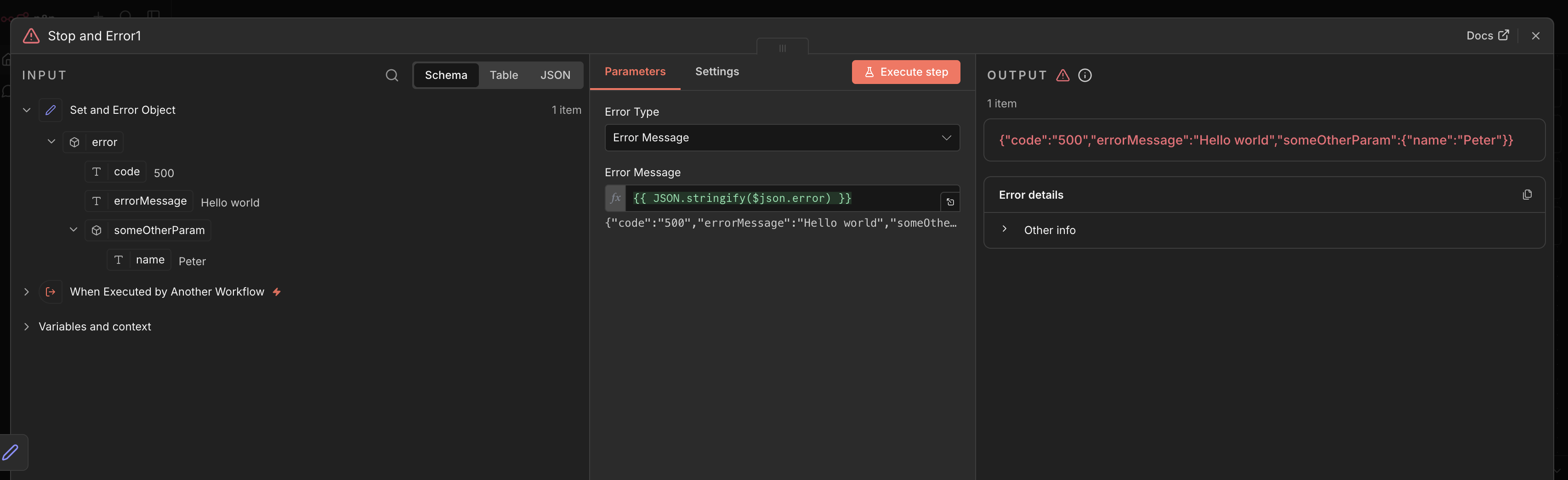 I’d like the parent workflow to be able to further handle the error, however all my attempts to pass an object using Error Type: Error Object have failed. It seems like this ‘object’ is always getting stringified which differs from my experiences with most other nodes. I have a strong suspicion this is a bug.