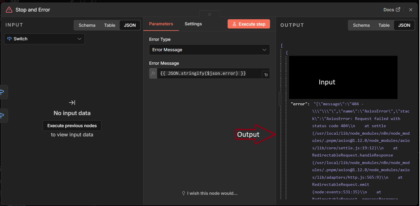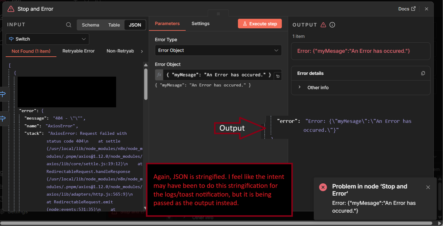 Now, when Stop and Error is hit, it throws up a little toast notification with the error message stringified. That makes sense, but I’m wondering if maybe that stringified value is what’s getting passed onward instead of the actual intended Error Object? Or maybe I’m just doing something horribly wrong.