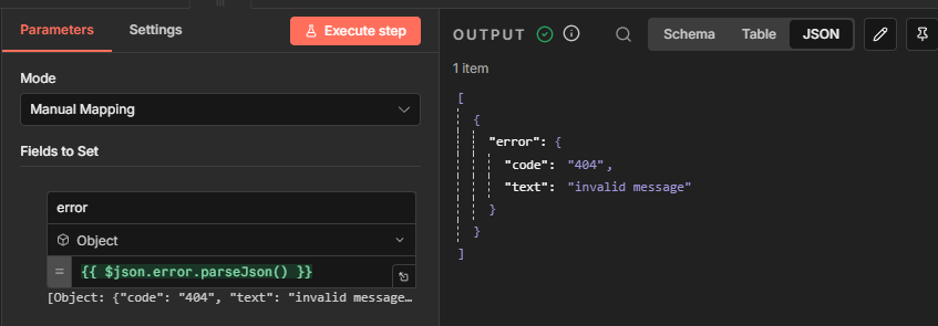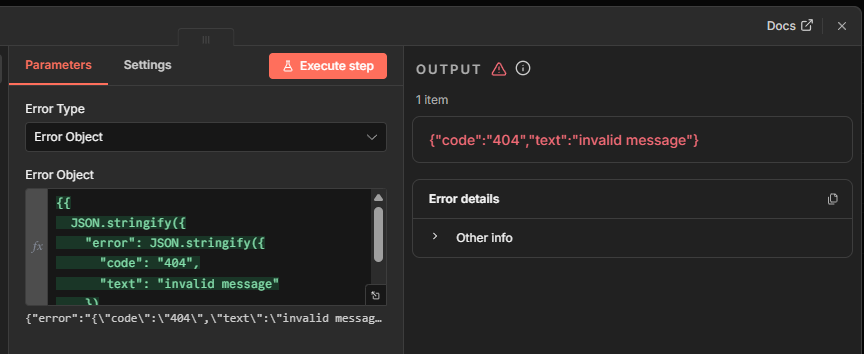 Now if I switch to Error Type: Error Object, my expectation would be that rather than ”error”: “message” I’d receive output along the lines of ”error”: {…}. Here’s a very simple example, a string is a JSON object so: