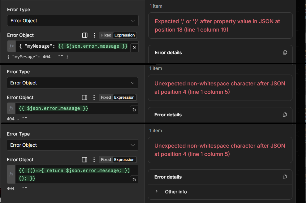 It gets even worse when I try to use expressions within the Error Object. Any attempts to use or return javascript objects without stringifying them myself results in an error within the node.