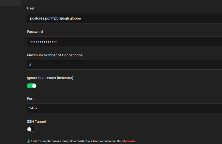 First, the Supabase pooler actually requires SSL to work, but the trick is to enable SSL and also turn on “Ignore SSL Issues (Insecure)” at the same time. Just enabling SSL alone without that option tends to break things in hosted environments like Render.
