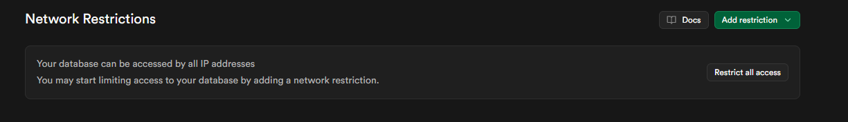 First, on the Supabase side, do you have any Network Restrictions enabled? If Render’s IP changed recently (which can happen), Supabase might be blocking the connection silently, which would explain the timeout instead of an auth error.