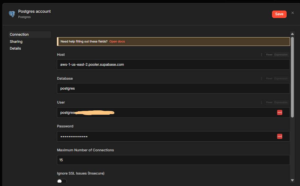 So I’ve been using this workflow for a couple of months but approximately a week ago, the PostgreSQL node stopped working. When I wanted to troubleshoot it, it says this error message that says “connection timeout”.