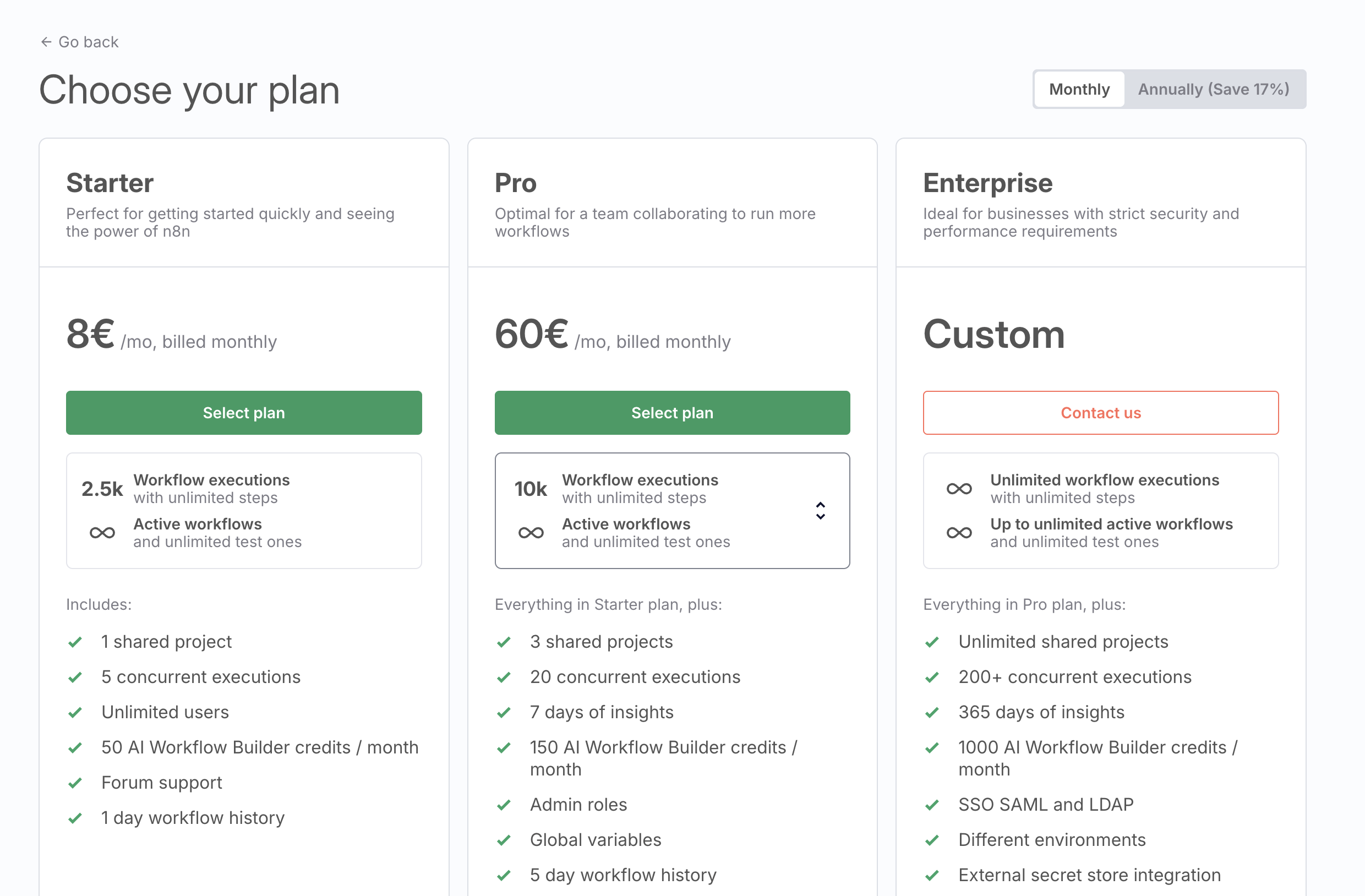 This is the pricing I see after I select upgrade my plan from my workspace, but the pricing on n8n website is different. Can someone help?