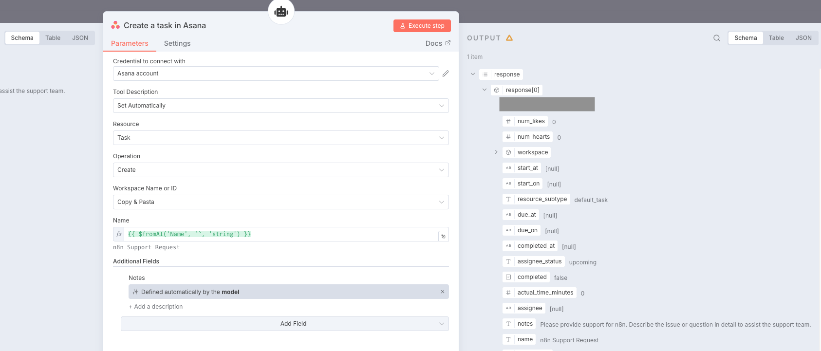I have a small problem configuring the Asana Tool node that is connected with an AI Agent. Some of the settings for the new task can be automatically defined by the AI model, which works perfect. The only thing that can’t automatically be defined seems to be the task name. For this I can only use fixed or expression.