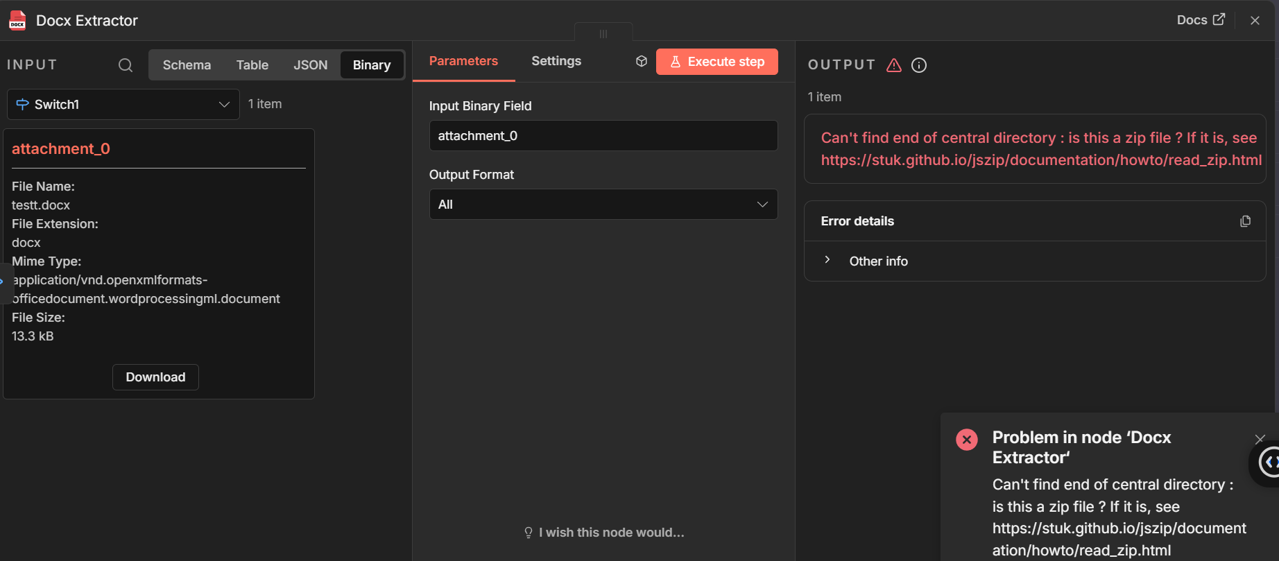 @jeimuzu18 Thank you so much! I have tried all your approaches but the Docx Extractor and the Convert File to Json node return the errors shown in the images. I have also tried your recommendations to change my code when using mammoth but they still return the same error. I think the main problem here is likely the Docx file format (i tried different .docx files but nothing changed)
