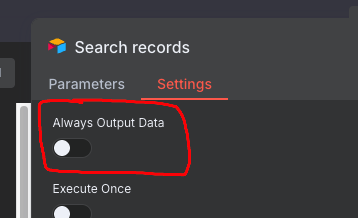 This being said, if you need to process this case - what you could do is you could go to “SEARCH” (Airtable) node, then to Settings and enable “Always Output Data”. This way the node will always produce some output - either what was returned by the airtable OR (this is important) - the empty json result (where empty is not equal to no result).