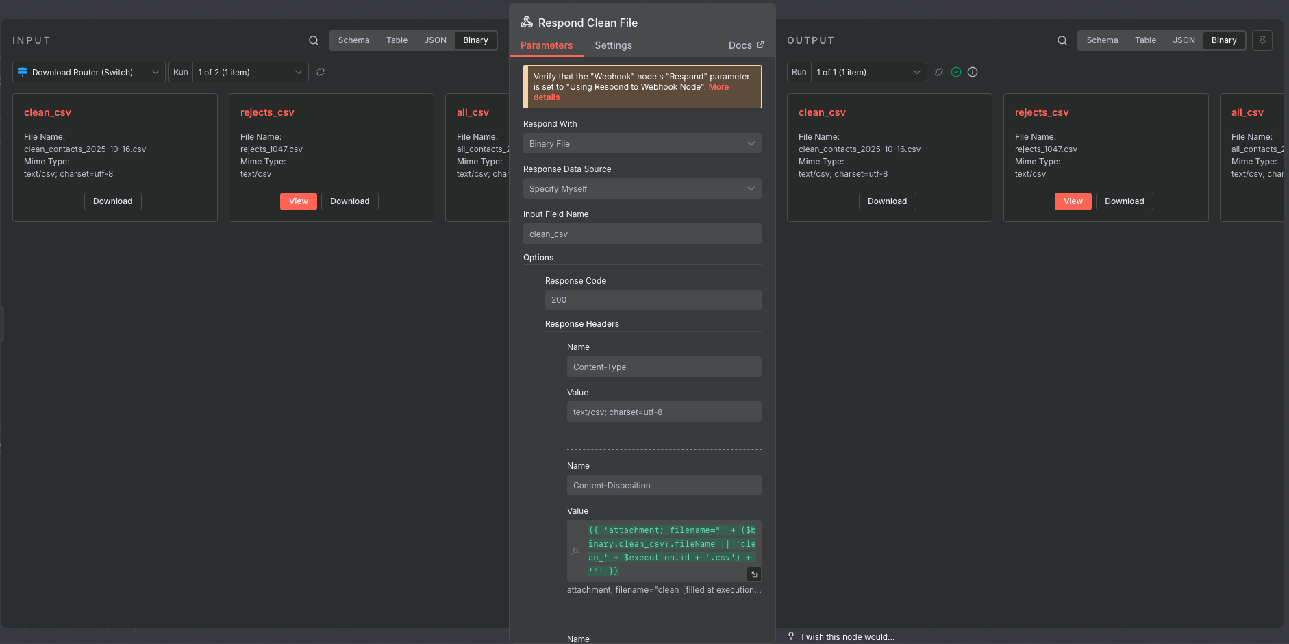 “NodeOperationError: The item has no binary field ‘clean_csv’ [item 0]”,