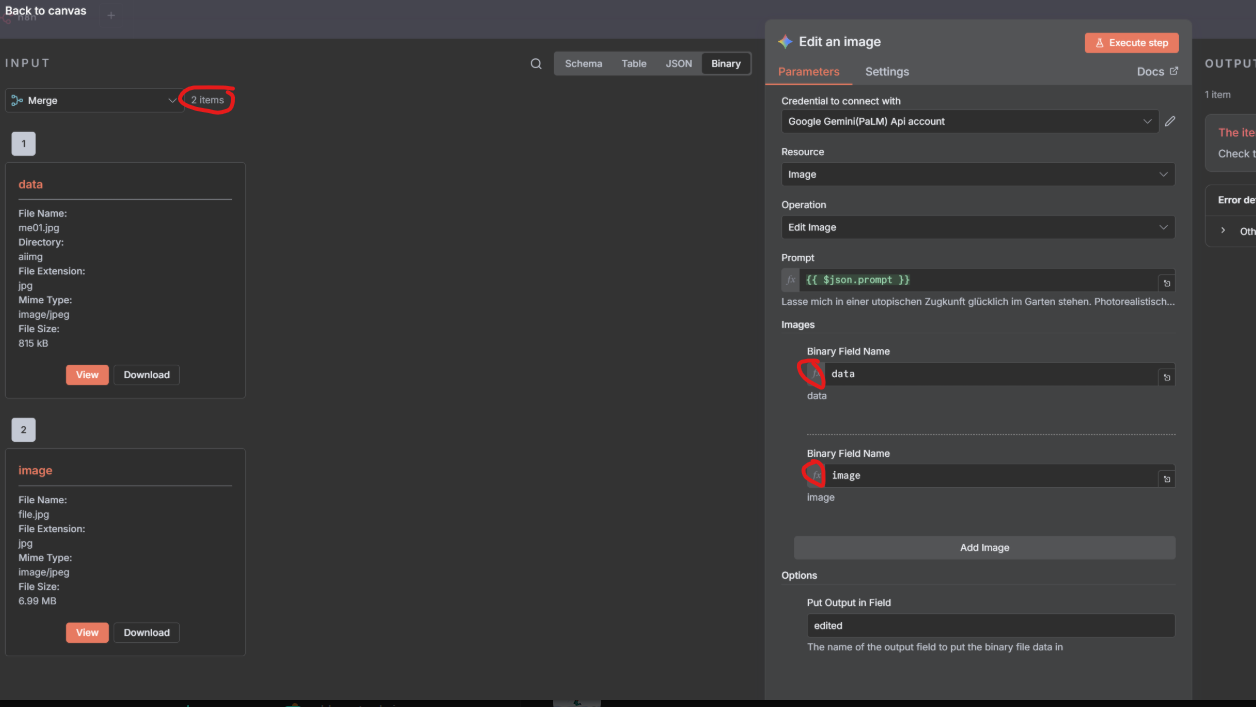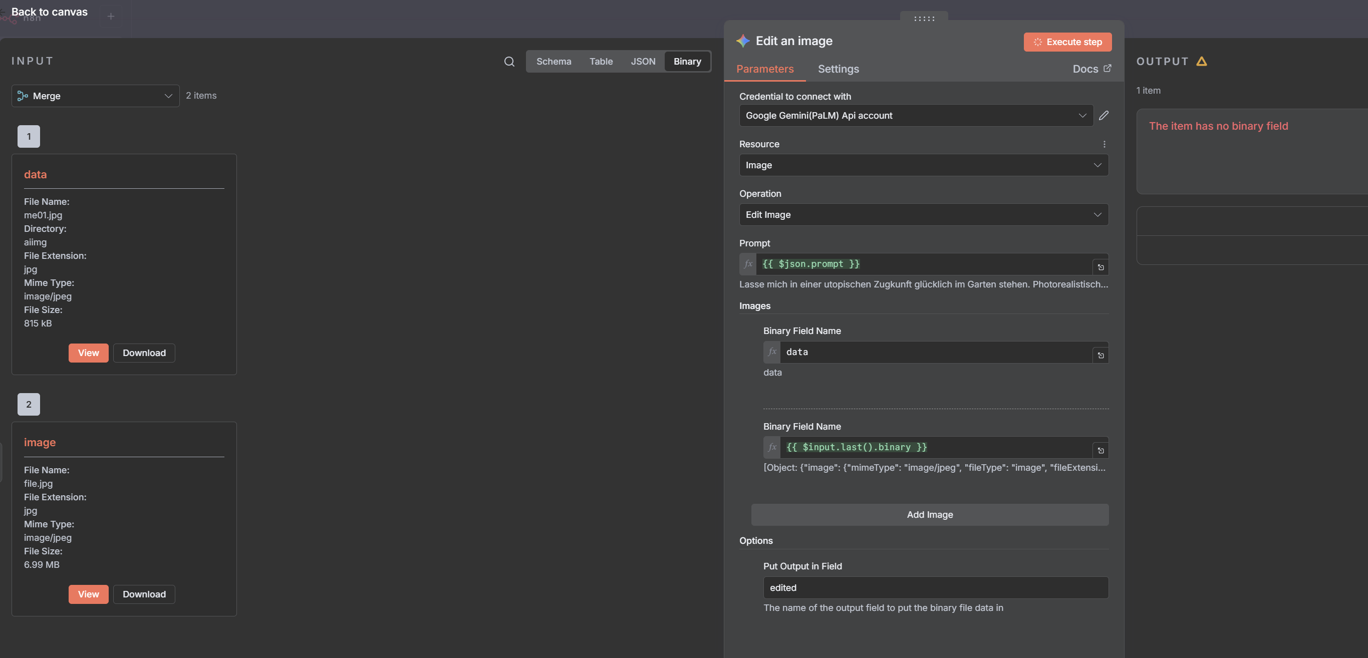 However, the Gemini node doesn’t recognize the second binary image and throws a “no binary field” error.