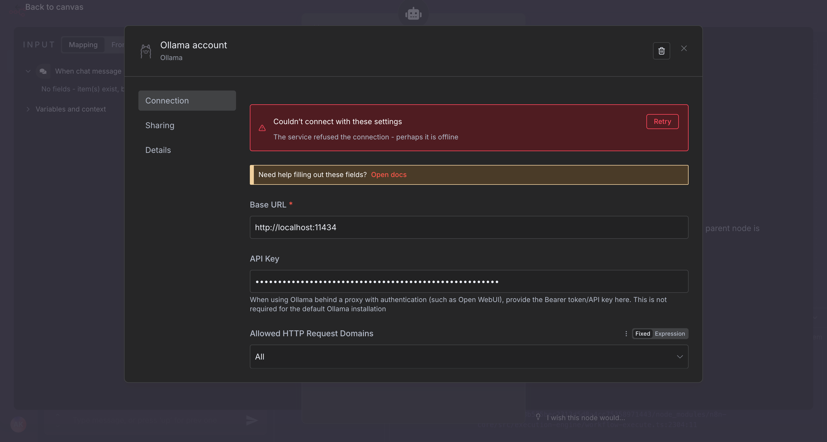 When I remove the “API Key” field from the LLM nodes (because Ollama is local and doesn’t require one), n8n throws a connection error:
