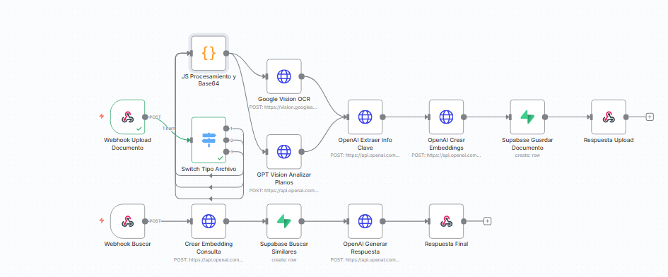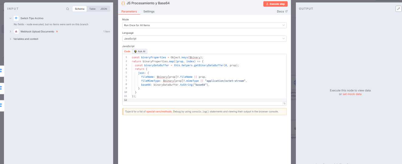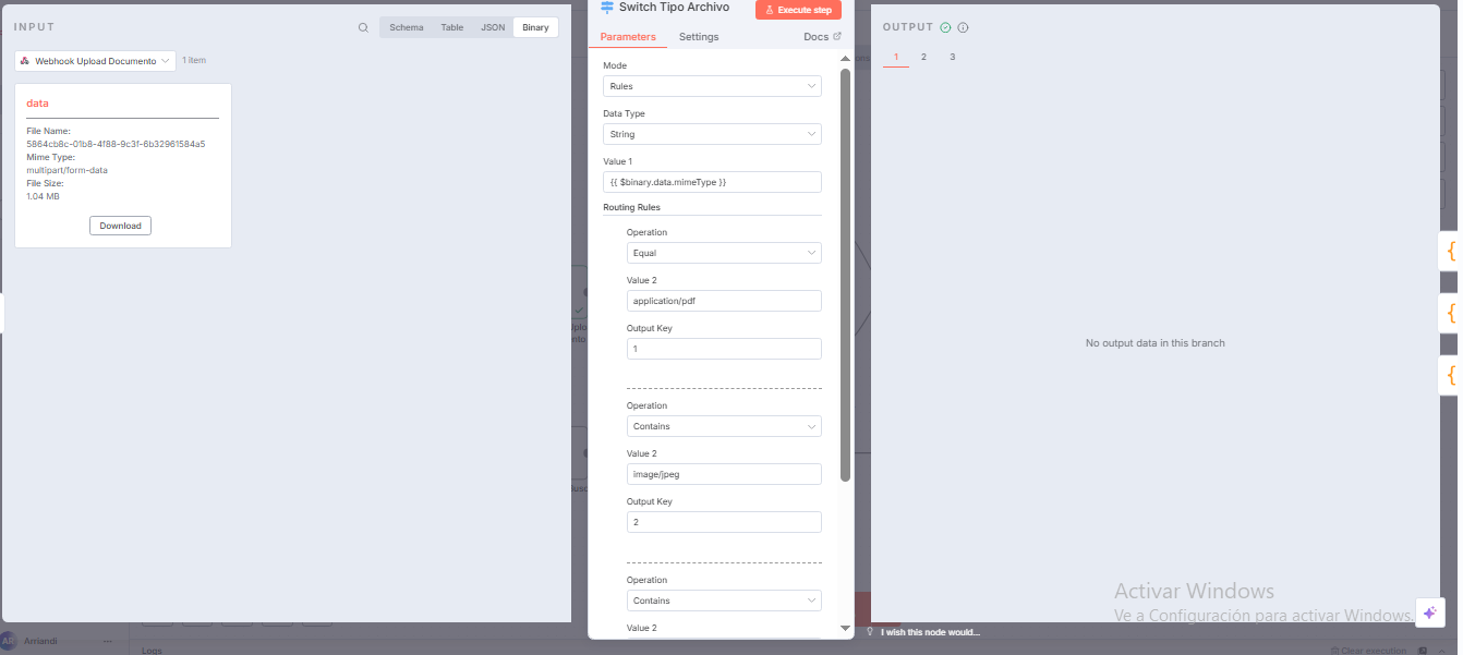 I have an n8n workflow that processes files uploaded via webhook, but it gets stuck at the Switch node and cannot advance to the following nodes. The workflow is designed to process different file types (PDF, images) and route them to different branches based on their type.