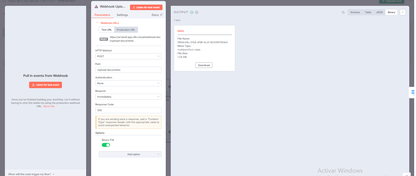 When I send a file to my Webhook node with Binary File = ON, the file metadata appears correctly in the Binary tab (file name, mime type, size, download button).
