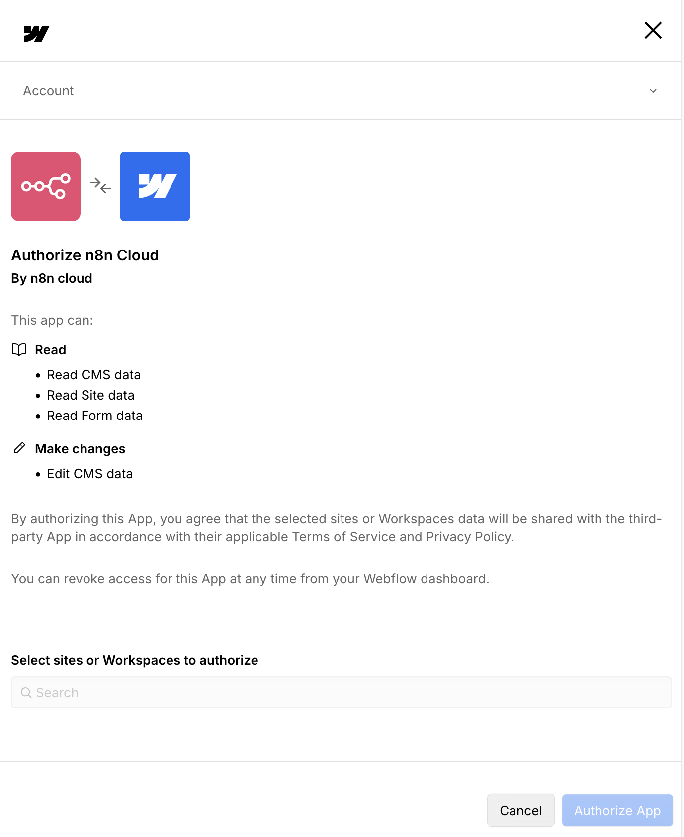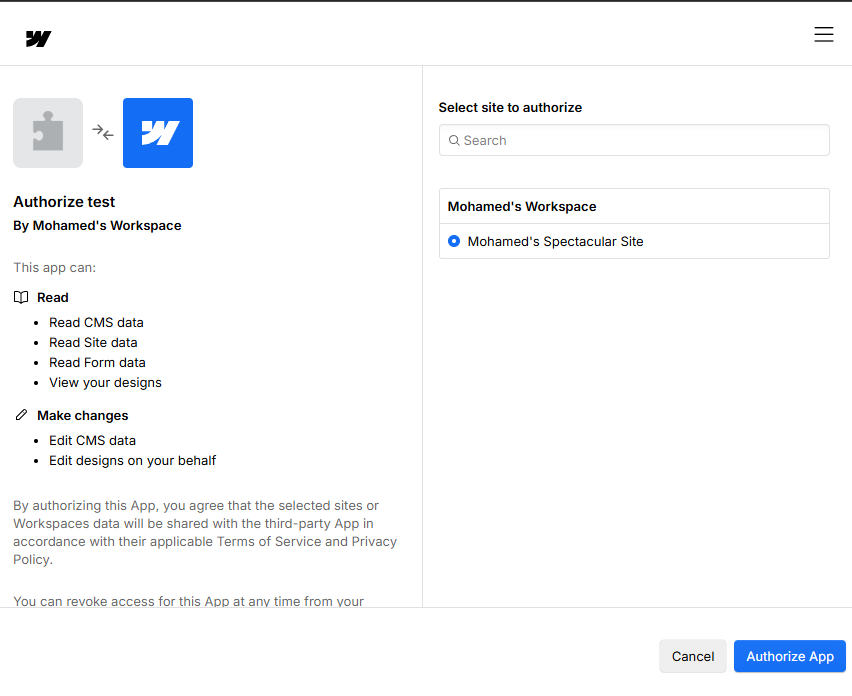 The pop-up opens, but I cannot select a workspace / site to authorize,