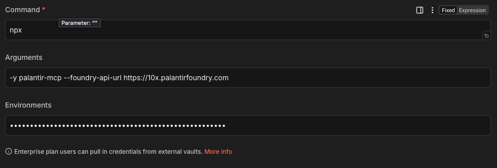 Then in your MCP Client node you can run it directly (again, preferably using full path from which palantir-mcp):