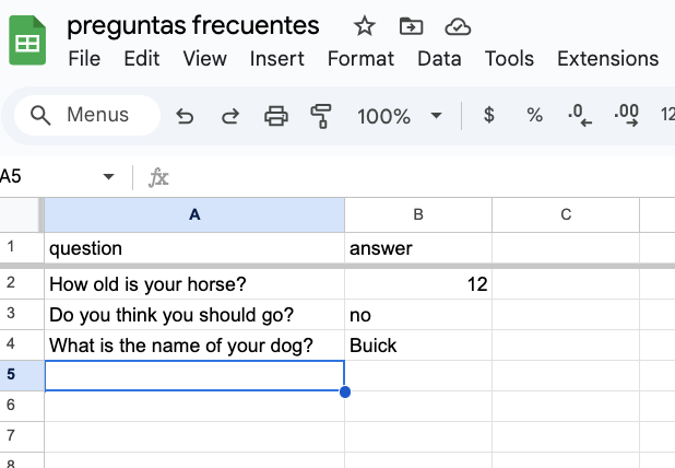 As i understand it is FAQ chatbot which has to answer questions from google sheet.