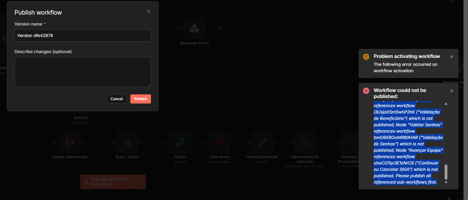 In my case, the main workflow calls 15 different sub-workflows. Sometimes, an inner workflow calls yet another one. This means I have to navigate through all 15 workflows and publish them individually.