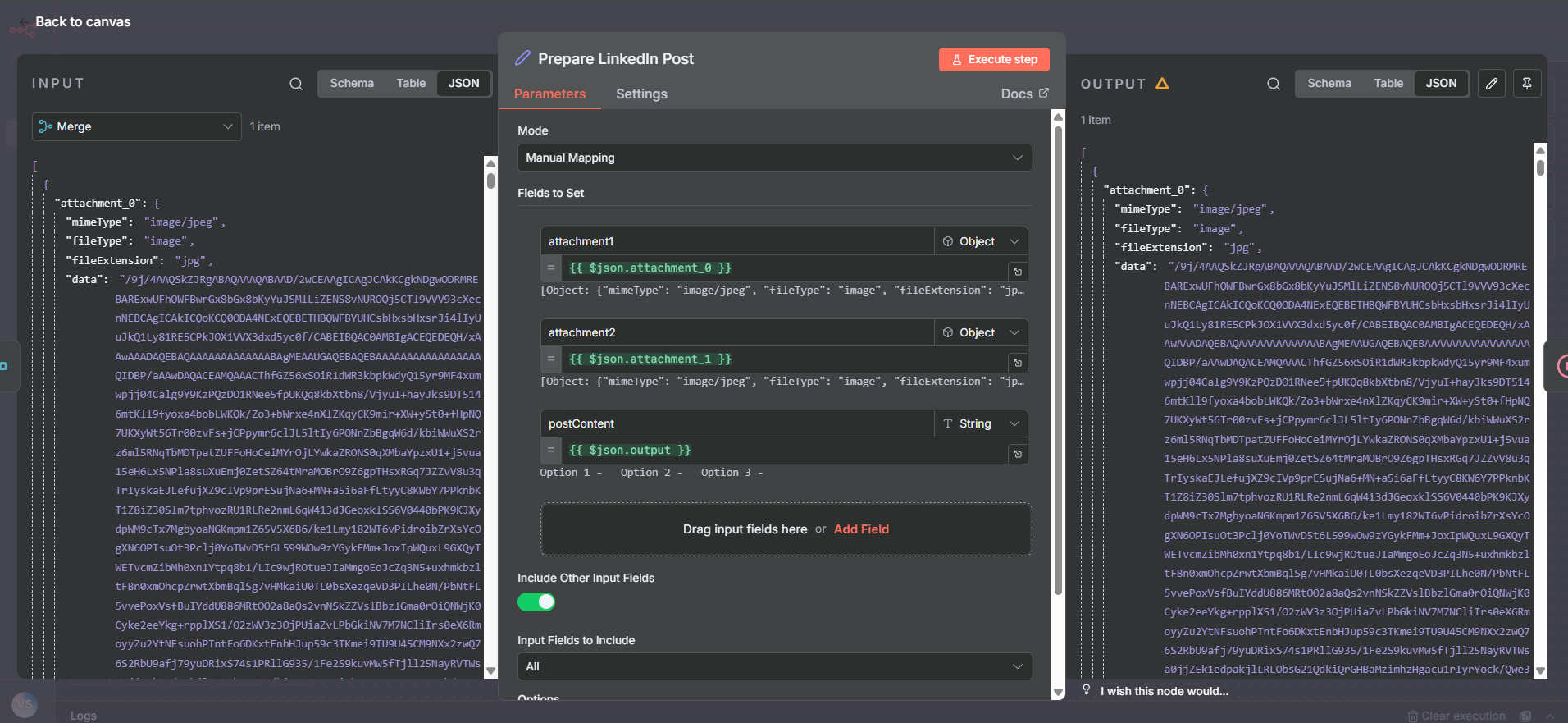 the merge node wont take the “content” variable. and i’m not sure i am doing this correct honestly. i have been working for ten hours on this so far. i want to end up with content and images ready to post into LinkedIn on monday mornings.
