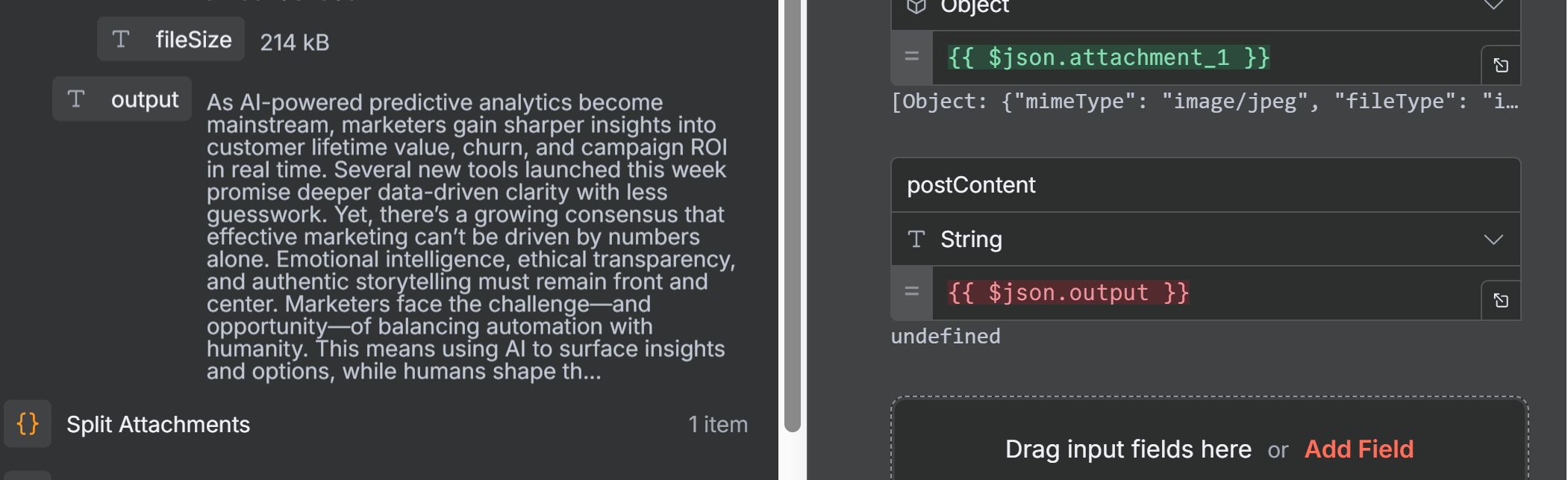 i will change that in the workflow. do you know why the “Prepare LinkedIn Post” node is saying that the postContent field is undefined when there is clearly data there?