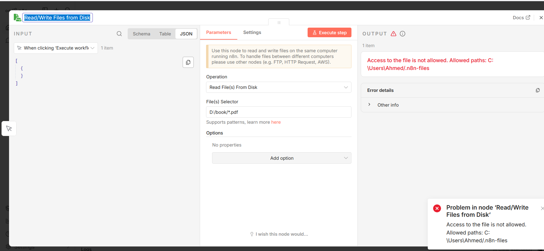 Hey! I encountered the same issue recently. The “Read/Write Files from Disk” node is restricted to the n8n user folder by default to prevent unauthorized access to your system.
