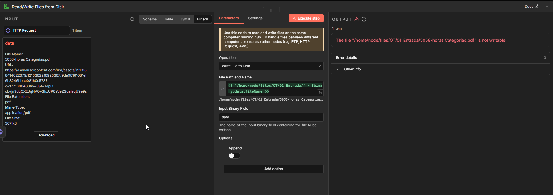 I have a workflow that works fine up to the HTTP request, but when I try to write PDF files to disk, I get an error saying I can't write to disk.