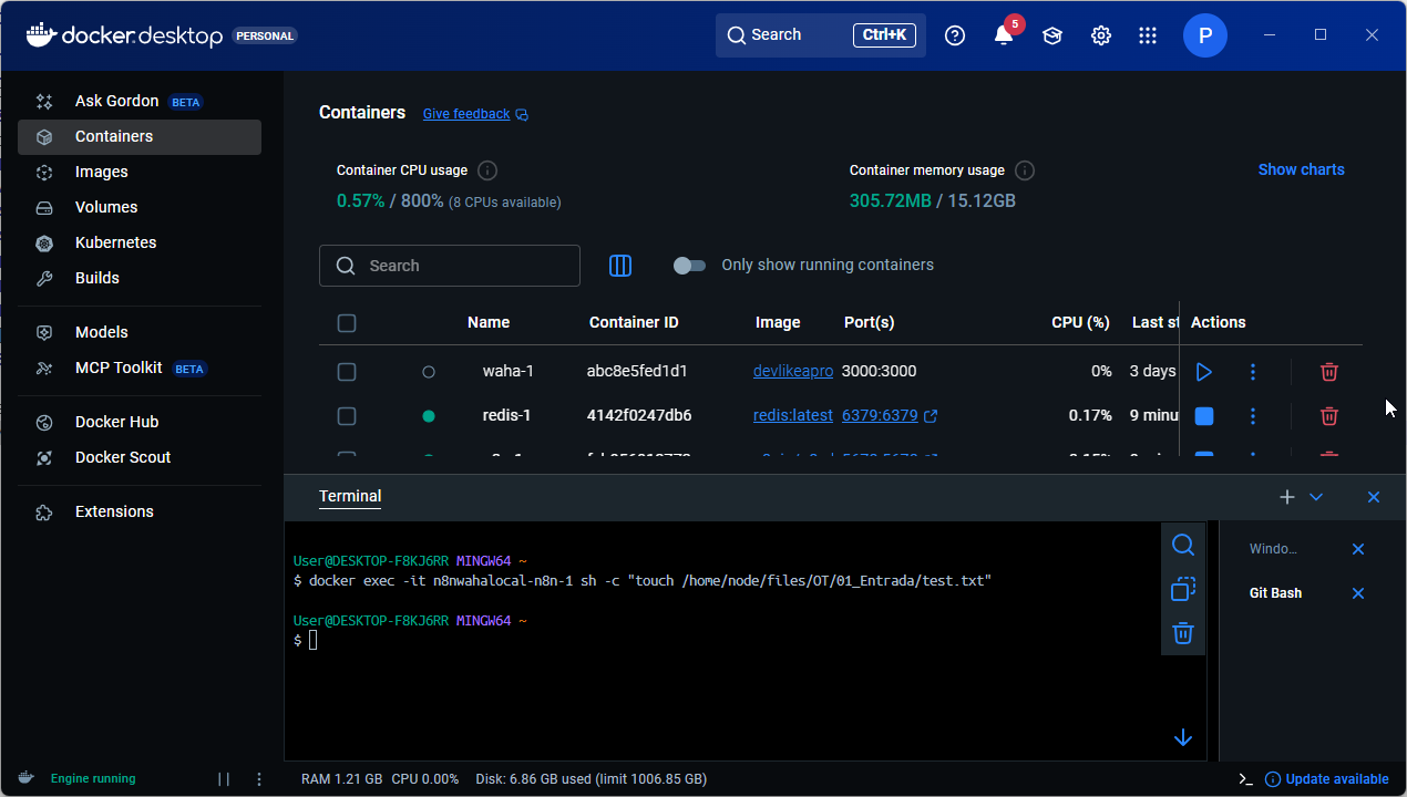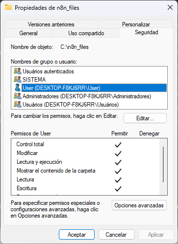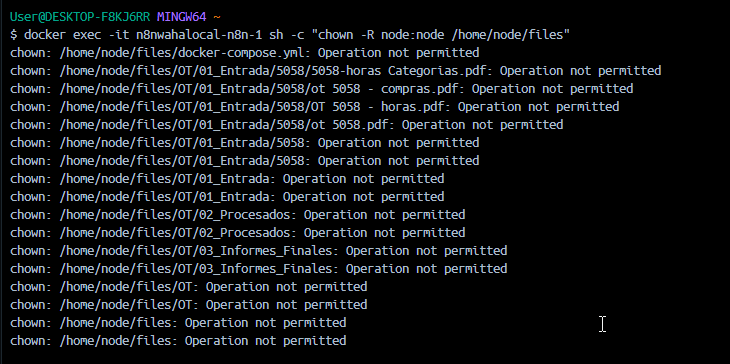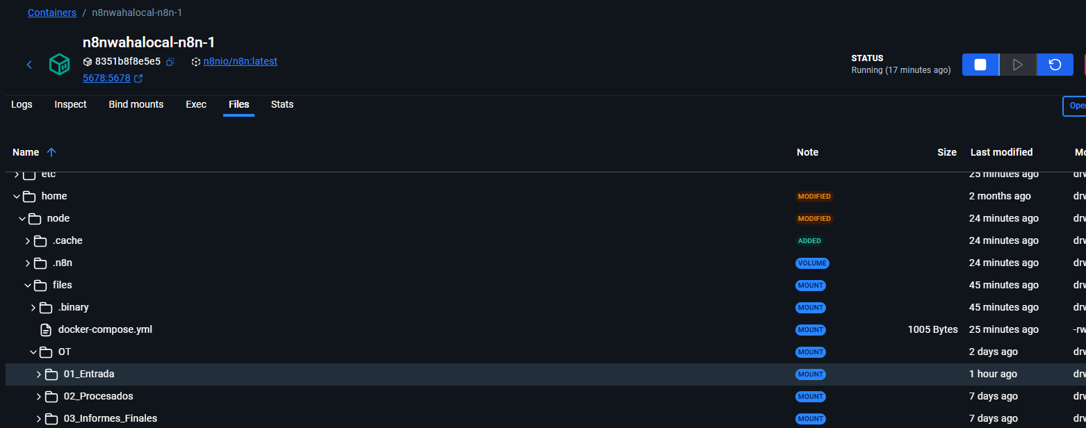 Looking at the screenshots, the folder structure exists inside the container at /home/node/files/OT/01_Entrada/ which is good, but the write still fails even with the path fix. Since you’ve already tried the N8N_RESTRICT_FILE_ACCESS_TO change and it’s still blocking, try running docker exec -it n8nwahalocal-n8n-1 sh -c "touch /home/node/files/OT/01_Entrada/test.txt" from your terminal to see if the container can actually write there at all — if that fails too then it’s definitely a Windows/WSL mount permission issue and you’ll need the user: "root" line or to fix the folder permissions on the Windows side.