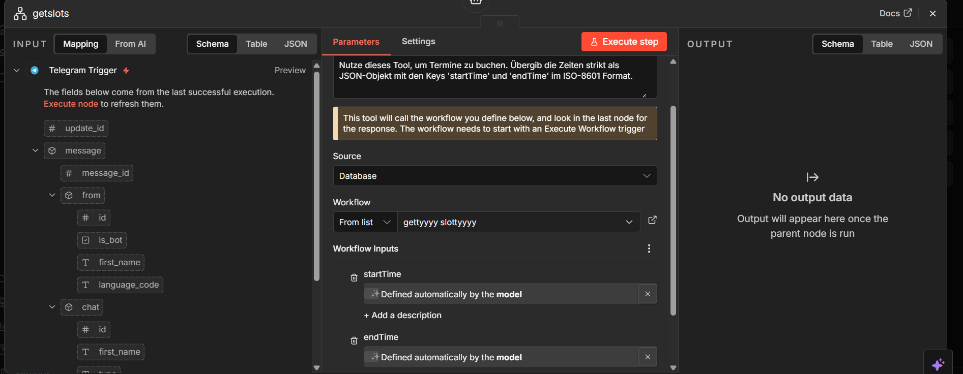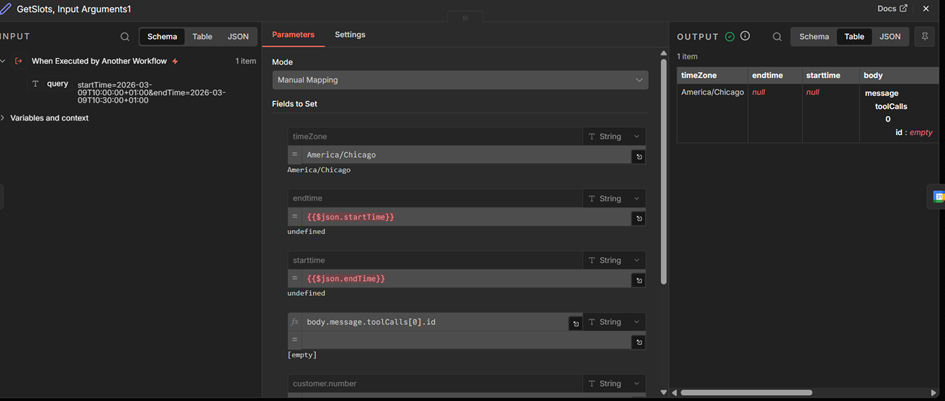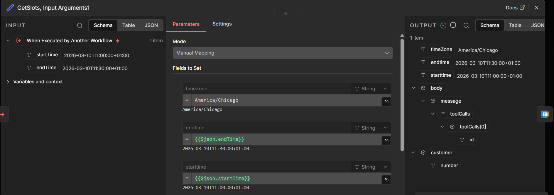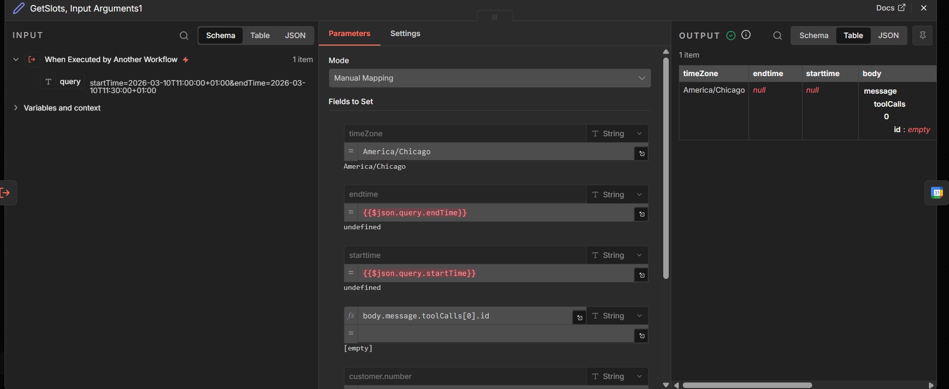 At the moment, everything that reaches the tool (subworkflow) “getslots” looks like this: