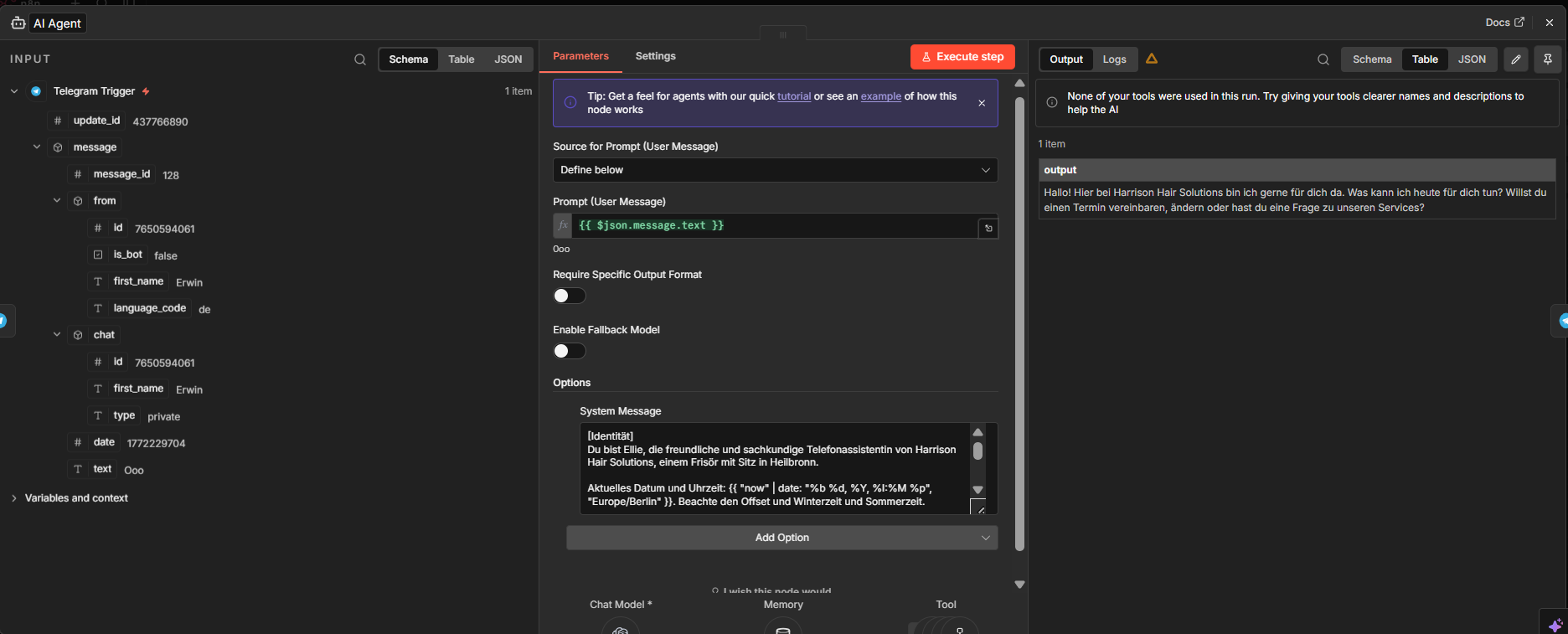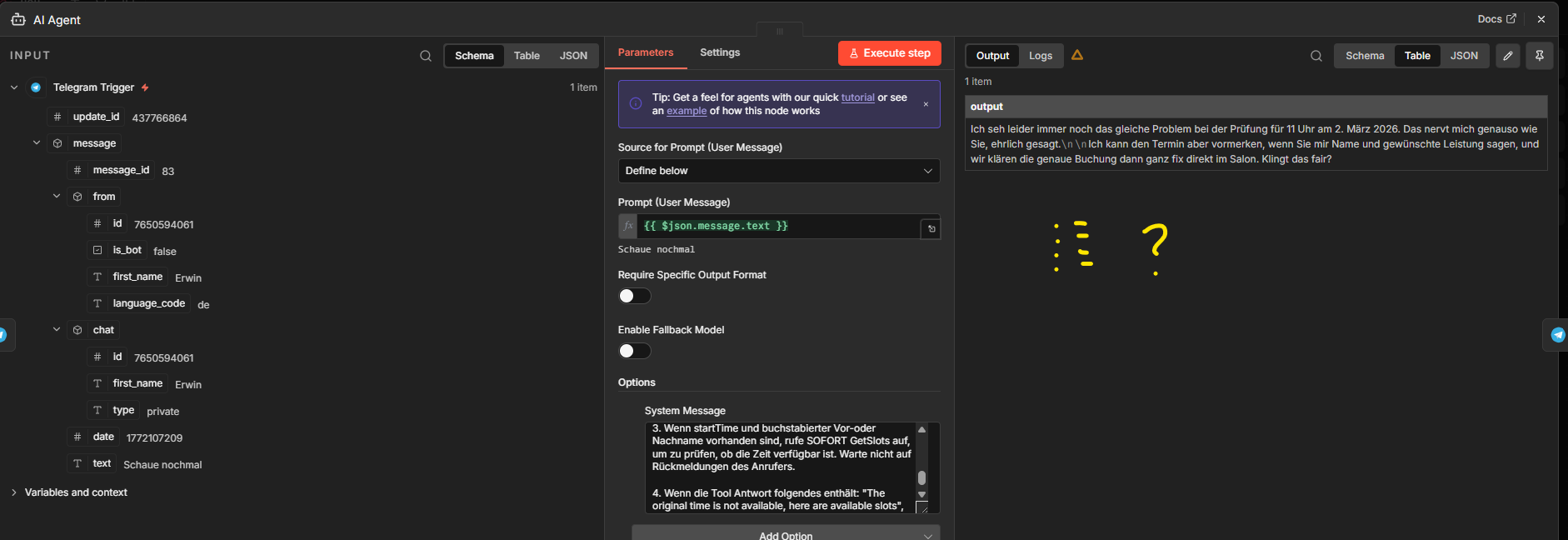 @tamy.santos where do I pass normal json? The screenshot of the AI Agent shows my options; System message or Prompt User Message - both are not the right places to do that, right? “Add Options” would be “Max Iterations/return intermediate steps/passthrough binary images/ enable streaming / batch processing” - where exactly put $json.startTime, $json.endTime as normal json? How to read them into the sub workflow?
