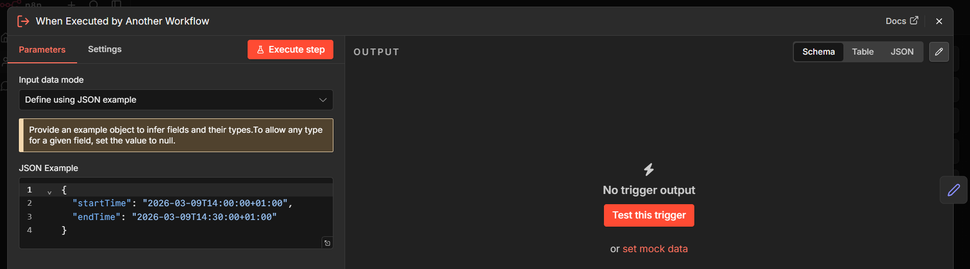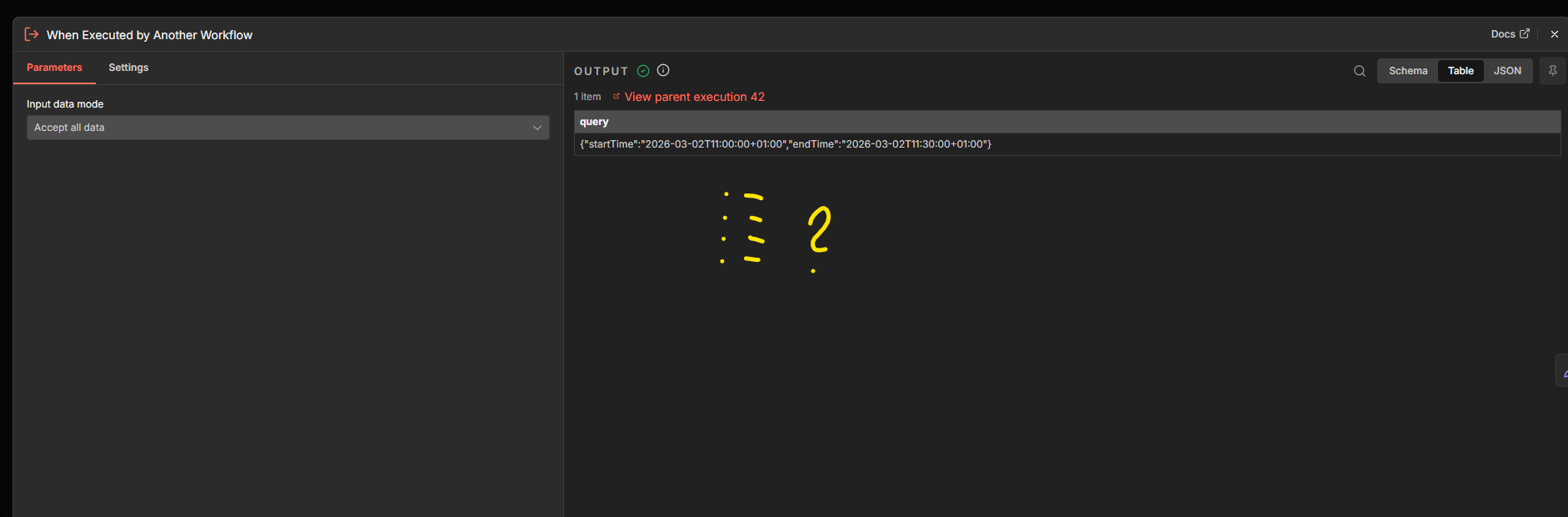 Thanks so much, this was it! This is my Sub workflow (the ai told me I should put an example in for both start-and endtime). Last Picture is the parent workflow, creating the two json parameters artificially. If it looks not like a total disaster for you, then I think I am fine, haha. Thank you again and have a great week.