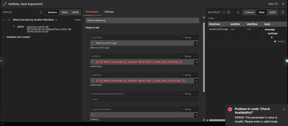 From your screenshots the sub‑workflow is receiving startTime and endTime in the trigger’s query string, so they live under $json.query, not directly on $json. In the Variables/Set node use {{$json.query.startTime}} and {{$json.query.endTime}}. If you instead pass a JSON body from the parent via Execute/Run Workflow, then they’ll arrive at the child as top‑level fields and you’d use {{$json.startTime}} and {{$json.endTime}}. Don’t try to reference the node name or read tool arguments directly, because the sandbox blocks that; always read from the trigger’s input.