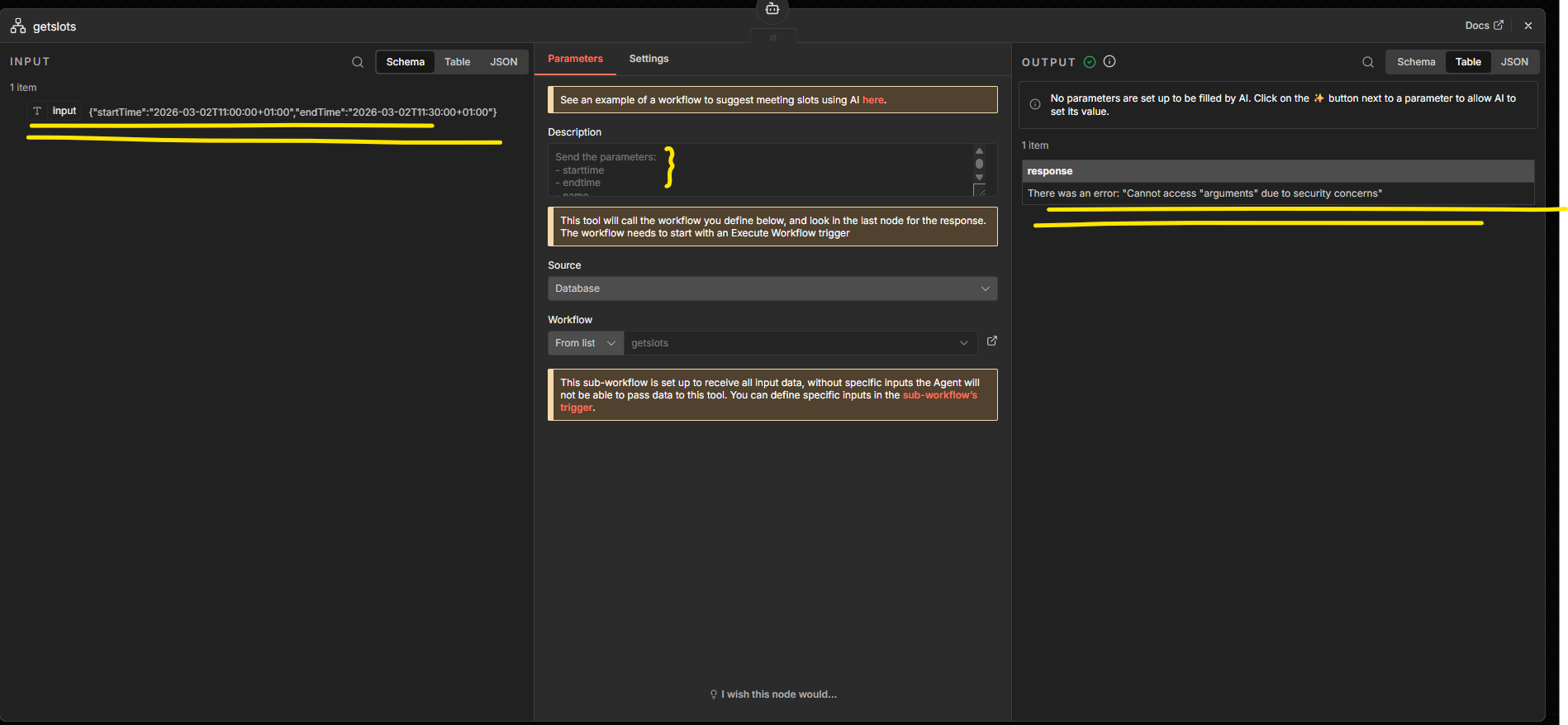 You don’t use the JSON inside the AI Agent because the Agent is only meant for text instructions to the model. Instead, you need to define startTime and endTime in the Workflow Tool itself. When the model decides to call the tool, it will send something like { startTime: …, endTime: … } automatically. Then, inside the sub-workflow, you should not try to read arguments directly because that is blocked for security reasons. The tool data is already passed into the workflow input, so you can simply access it using {{$json.startTime}} and {{$json.endTime}}.