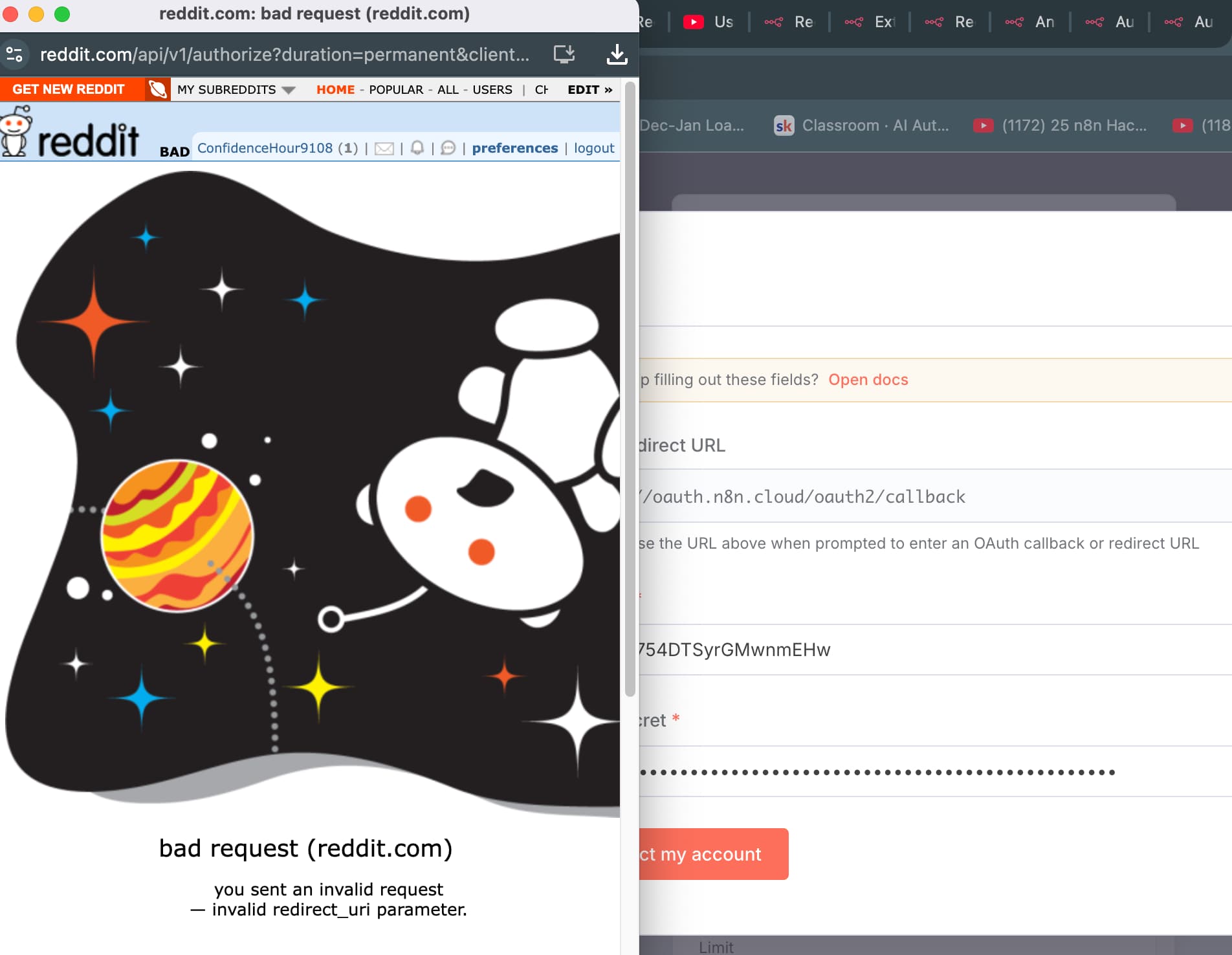 I am trying to connect Reddit API with my n8n, but it showing following error, please guide am noob.
