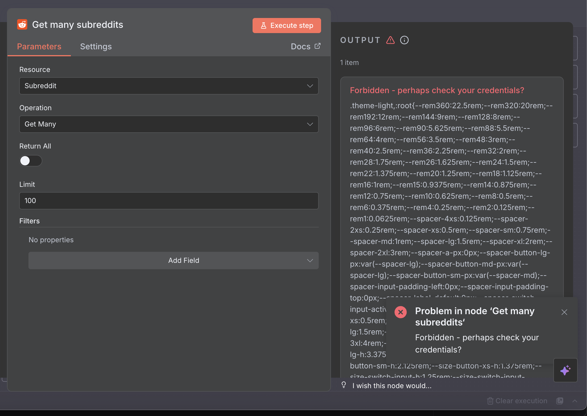 I’m trying to use the Reddit node Subreddit → Get Many, but I keep getting the error: Forbidden – perhaps check your credentials?.