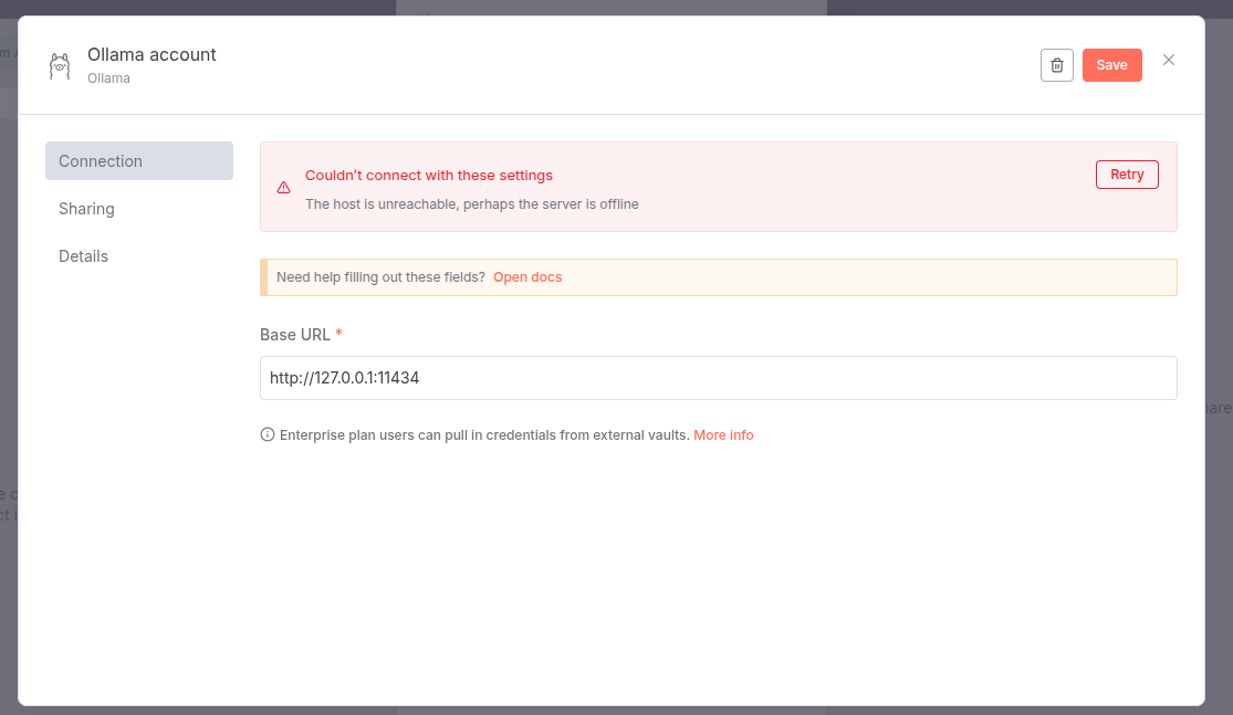 - an attempt to create credentials in n8n for ollama and pointing it to 127.0.0.1:11434 results in