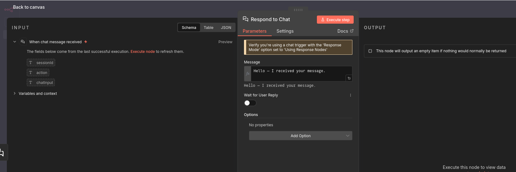 Not sure if my assumption is correct or not. To replicate the issue what i did, if we execute ‘Respond to chat’ node by clicking on ‘Execute step’ and not from the start. it gets stuck for me as well.