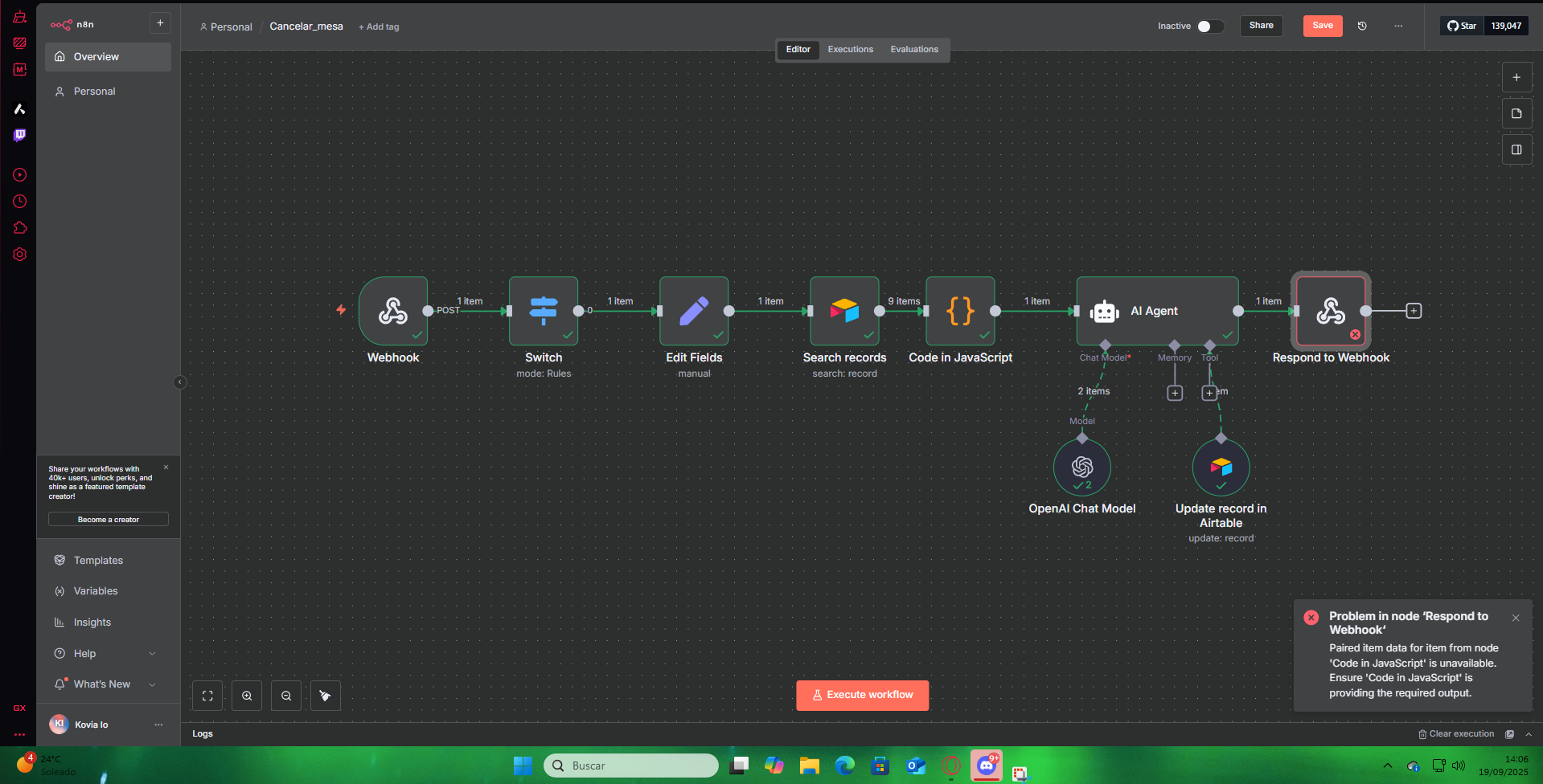 Change the reference from .item.json to .first().json. This can happen when debugging and running these workflows manually