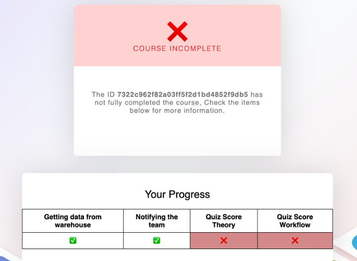 It says it is incomplete but I’ve completed my test and workflows so many times. I do not receive and email upon completion. I think there may be a bug with my account.