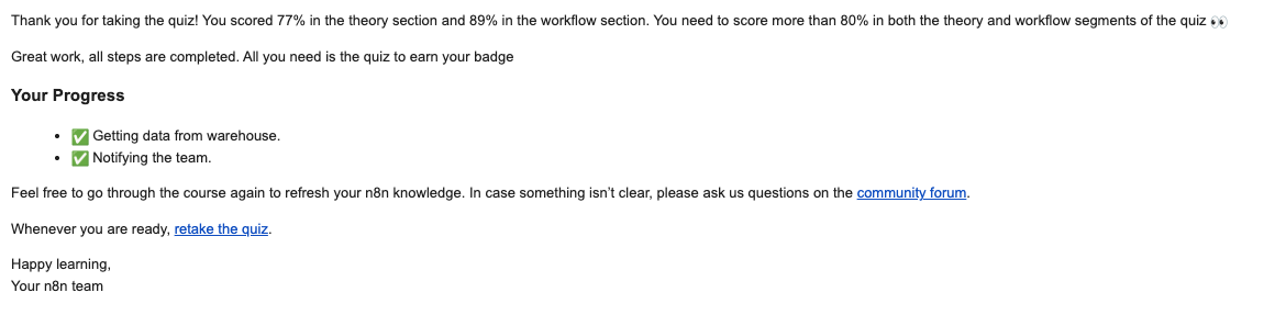 I have sync’d your quiz results, however you have not passed this time. Please make sure you select all the correct answers for the theory and the workflows you completed during the course will give you the data you need for those answers.