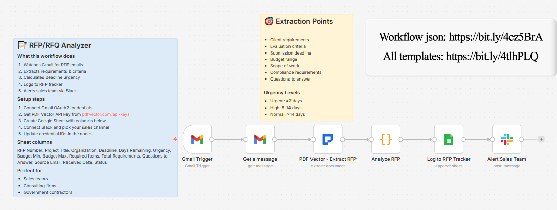 RFP email arrives in Gmail → downloads PDF attachment → extracts full opportunity data → calculates days until deadline and urgency level → logs to RFP tracker → alerts sales team on Slack