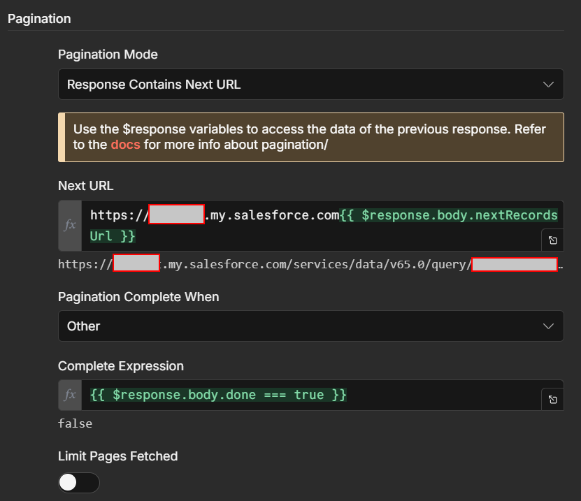 {{ $response.body.nextRecordsUrl ? https://YOUR_INSTANCE.my.salesforce.com${$response.body.nextRecordsUrl} : ‘’ }}