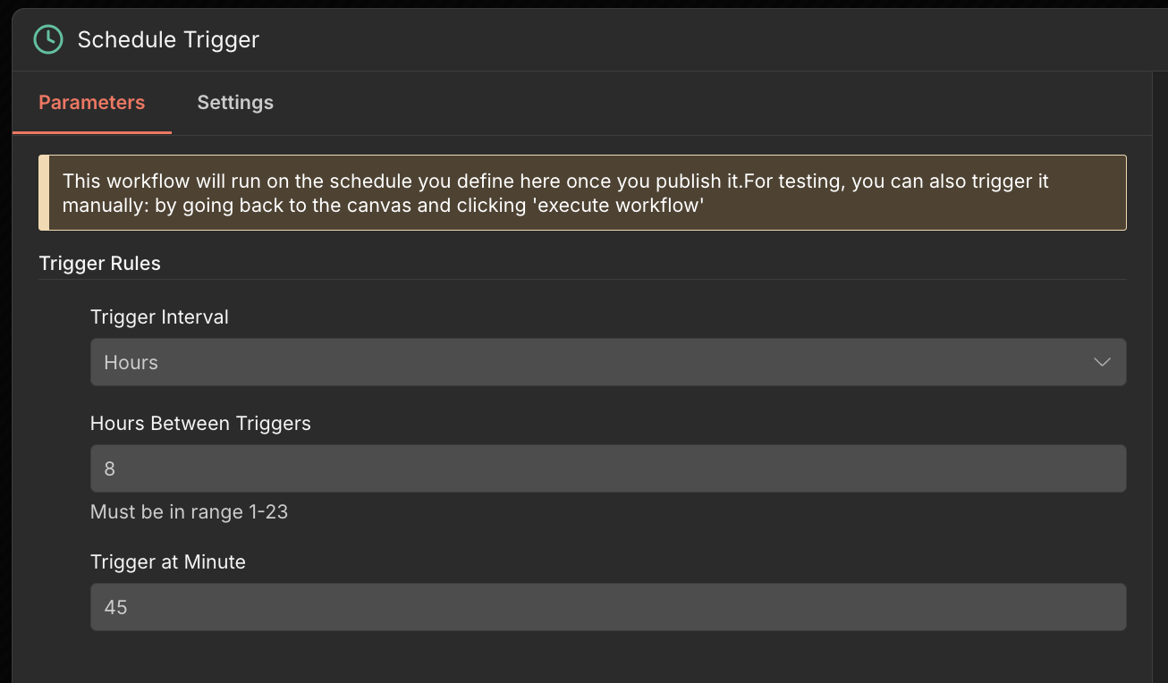 On n8n cloud, I have a workflow where the Schedule Trigger is set to Trigger Interval: “Hours”, Hours Between Triggers: “8”, Trigger at Minute: “45”.